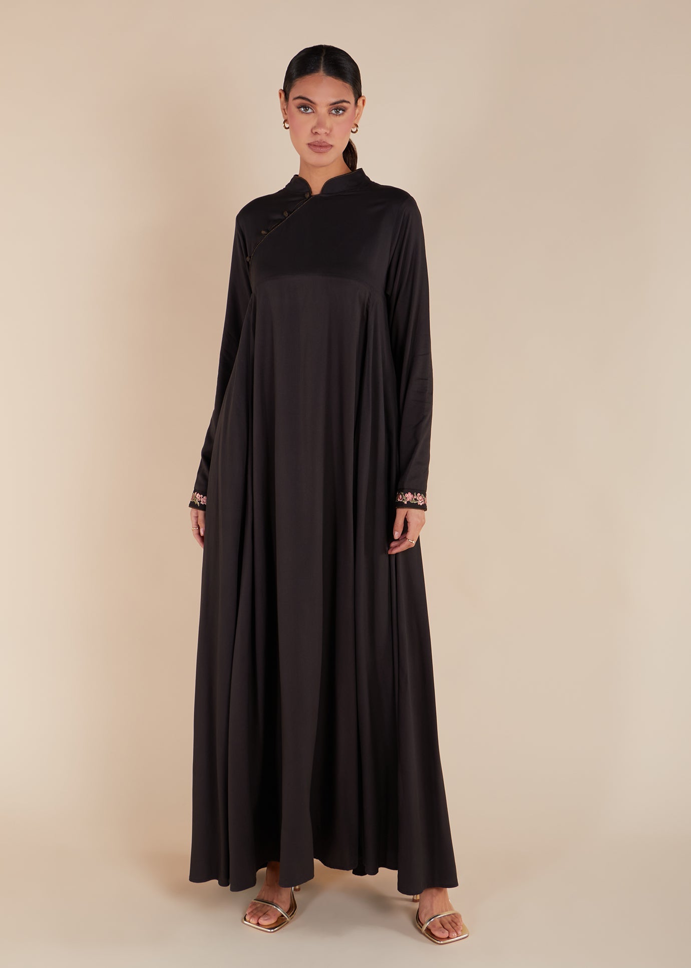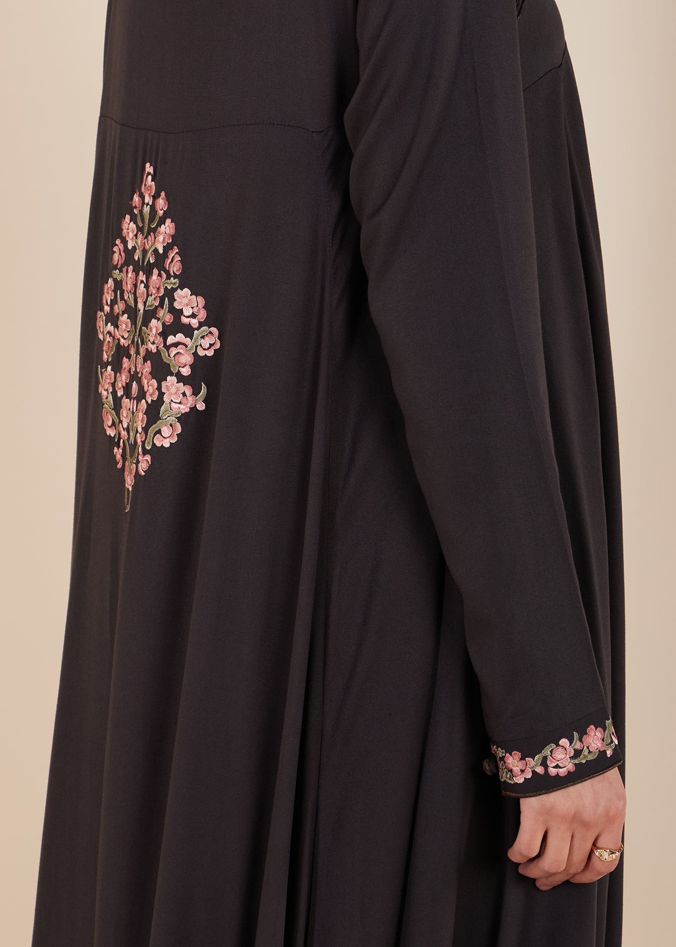 This Abaya, made from a soft twill fabric in deep charcoal, features our renowned floral motif in subtle shades of pink and green. The oriental-inspired buttons, highlighted by Missouri piping, add a touch of elegance, making this a perfect choice for any occasion.
