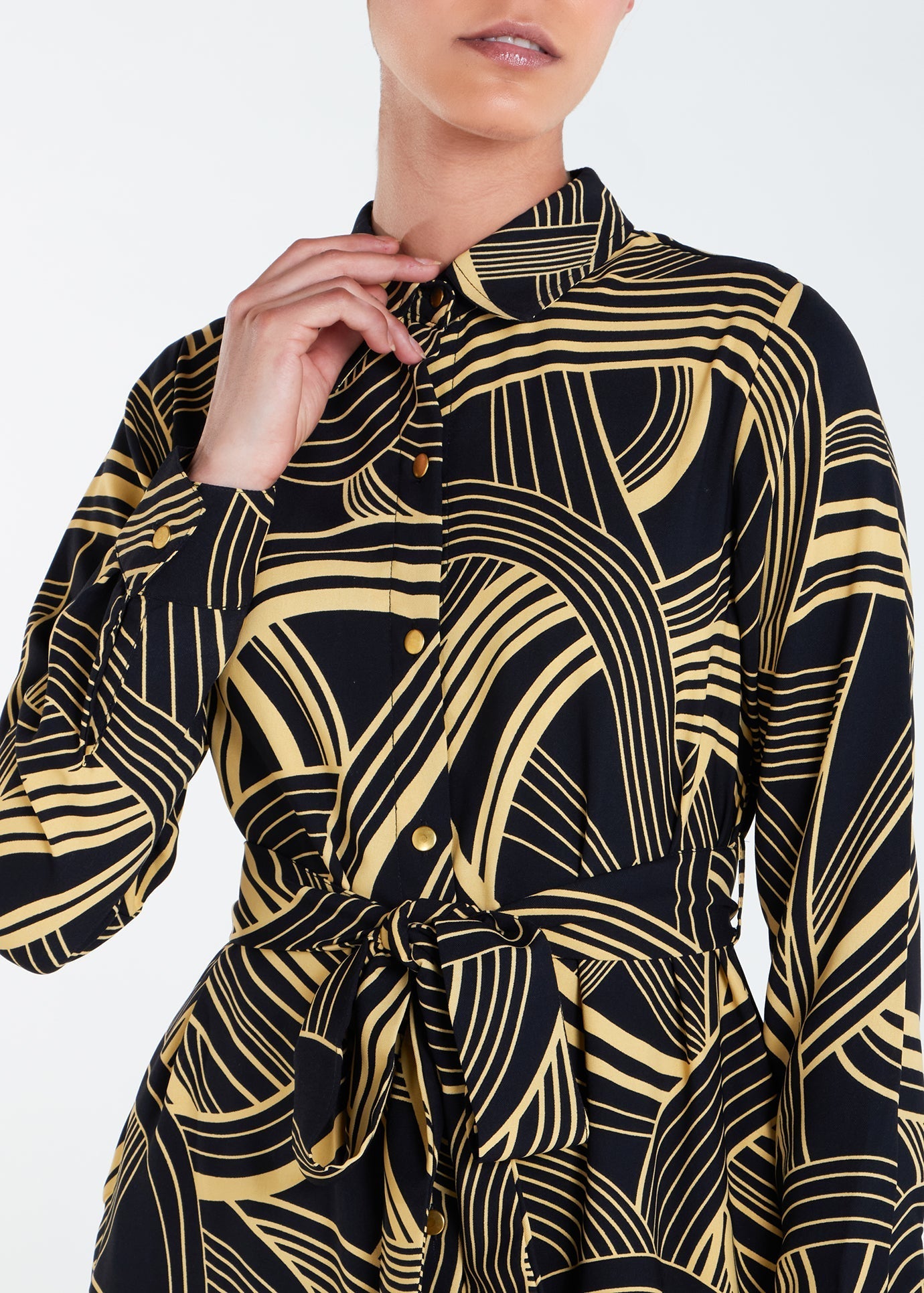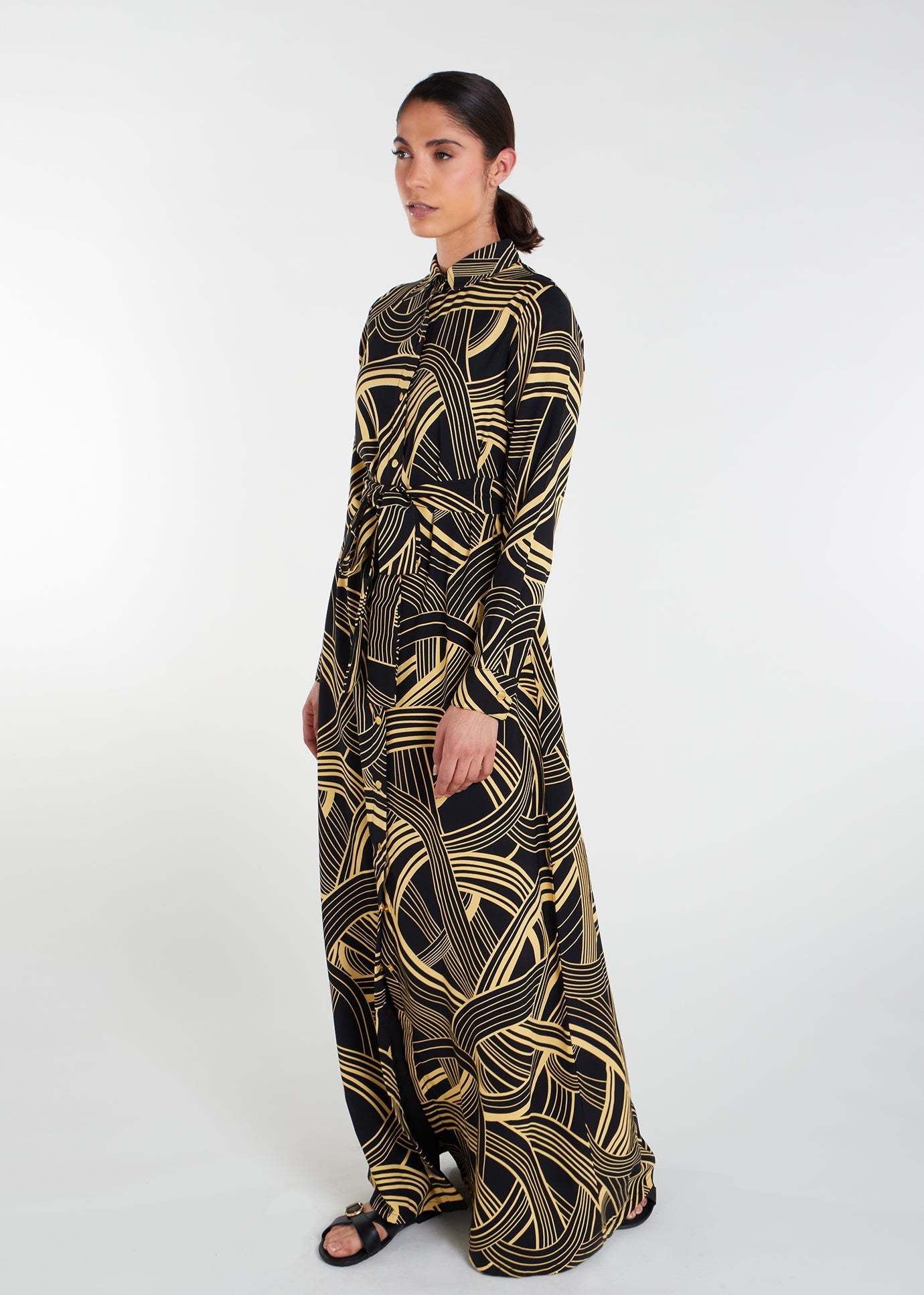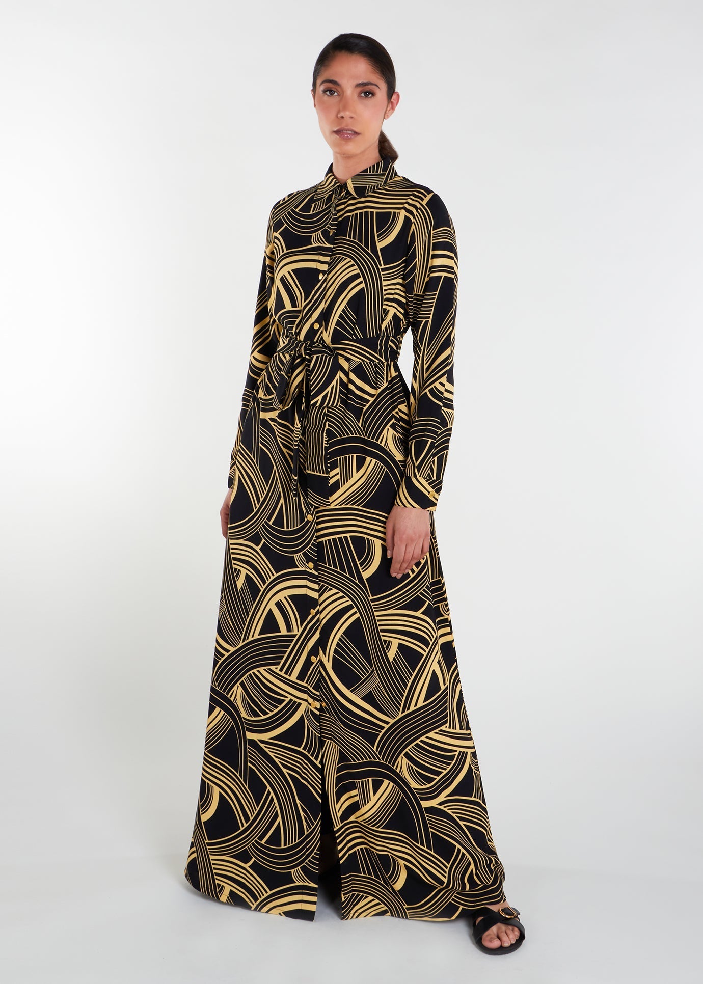 This maxi dress is fully lined with a vibrant black and mustard print, discreet side pockets, and gold snapper buttons to accentuate the look. Its crease-free design makes it perfect for warmer weather.