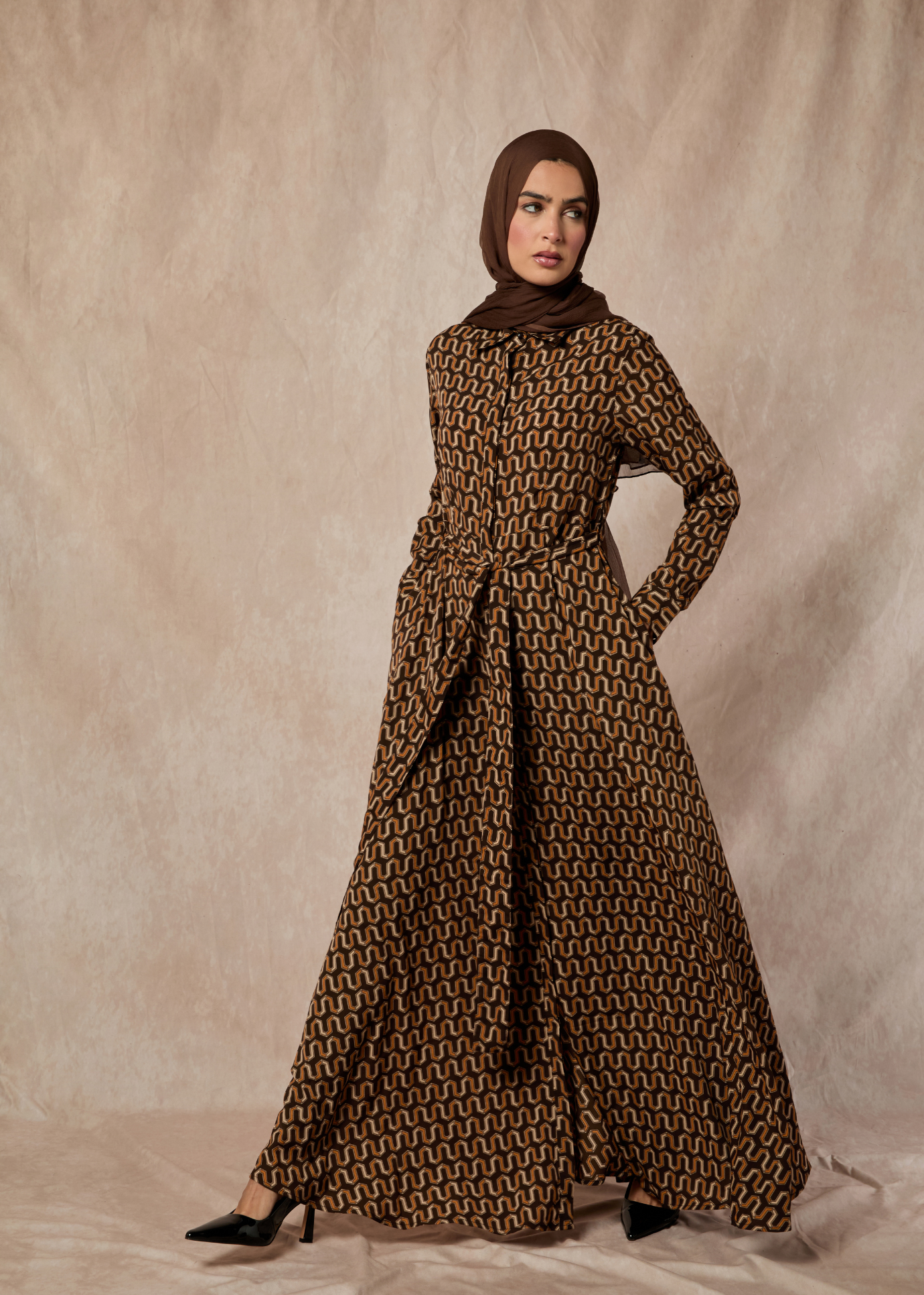 The Retro Maxi has a geometric design in warm autumn shades of beige, brown, and black. This flared maxi shirt dress includes a self-fabric belt to define the waist or can be styled with your preferred accessories. It features classic collars, shirt cuffs, and a full button-down front, making it suitable for various occasions. Made from lightweight fabric, it is ideal for transitional seasons and layering during cooler weather.