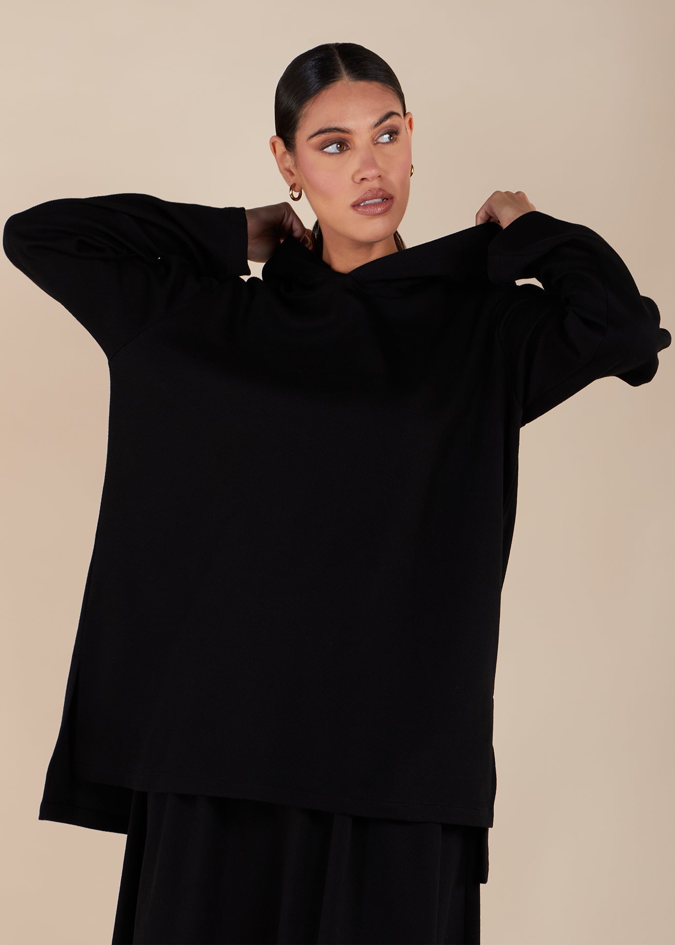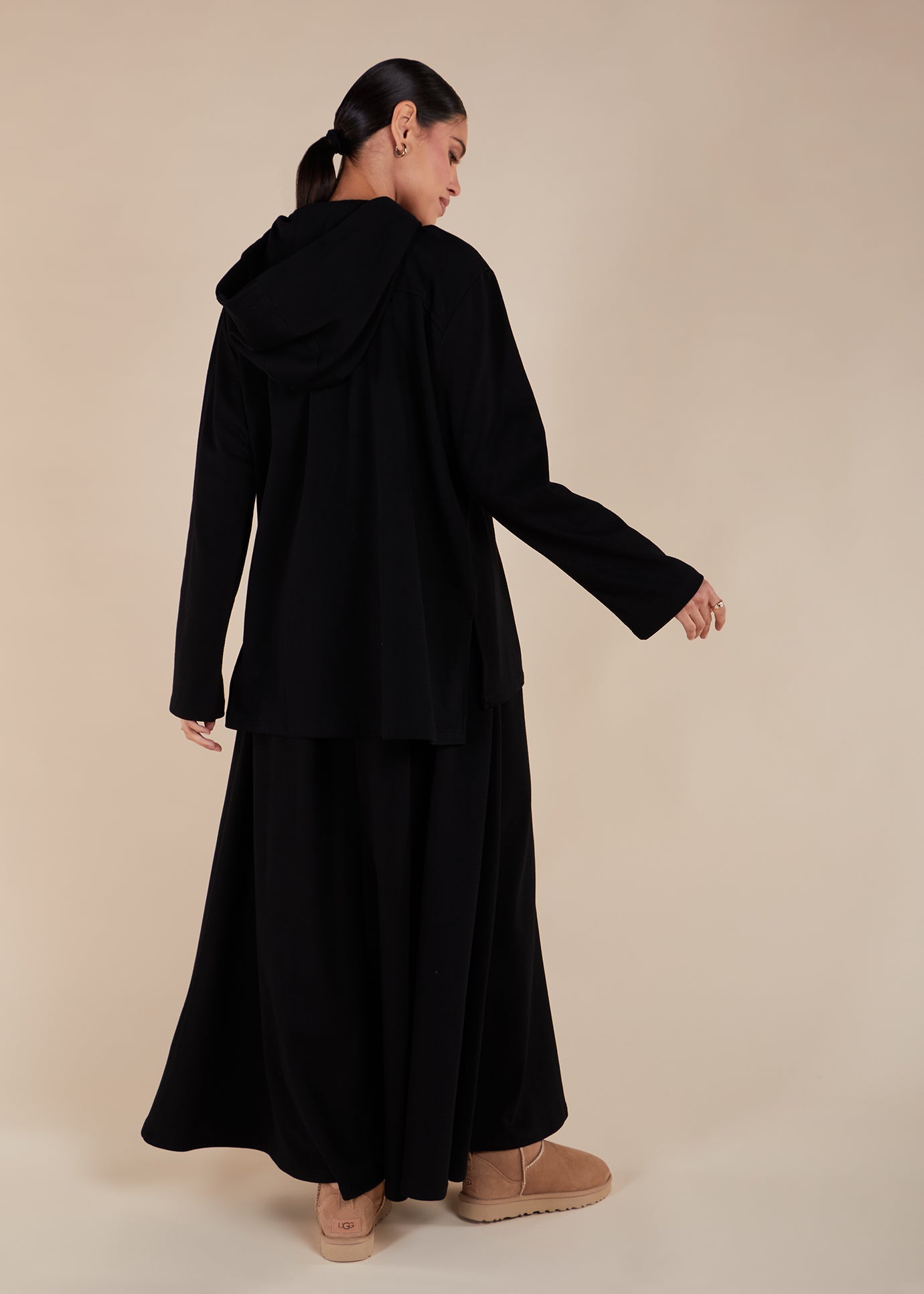 This two-piece Ribbed Co-Ord Set features a loose-fitting, casual design made from ribbed, combed fabric. The hooded top is accompanied by a skirt with a comfortable elasticated waistband. Both pieces are designed for maximum comfort and style.