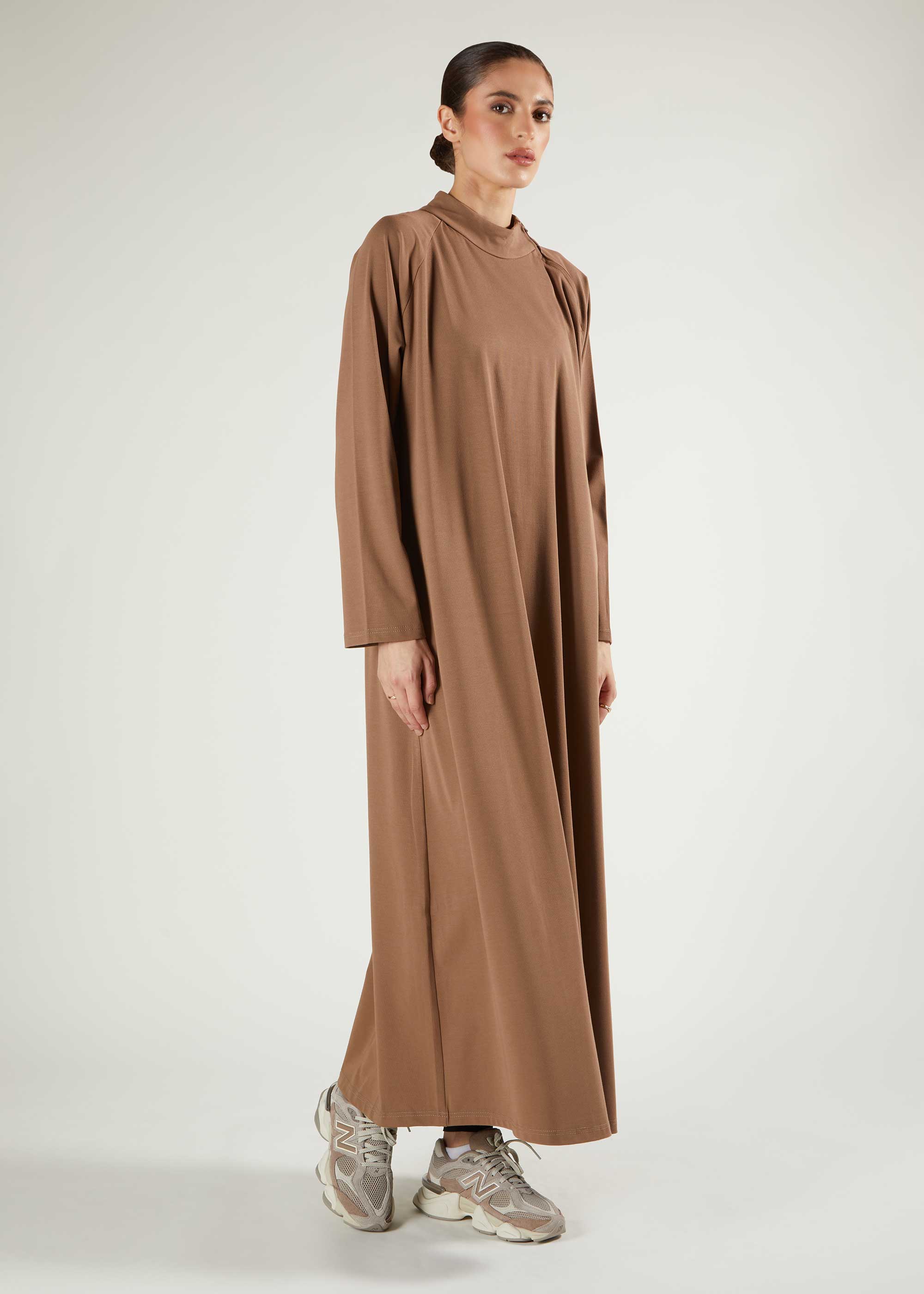This transitional abaya is made from a soft, medium-weight ribbed fabric, ideal for the season. It features an A-line silhouette with discreet side pockets and a subtly raised neckline. The side zip allows for easy dressing and maintains a sleek, polished appearance - perfect for winter styles with tucked-in Hijabs. Offered in three colour options.