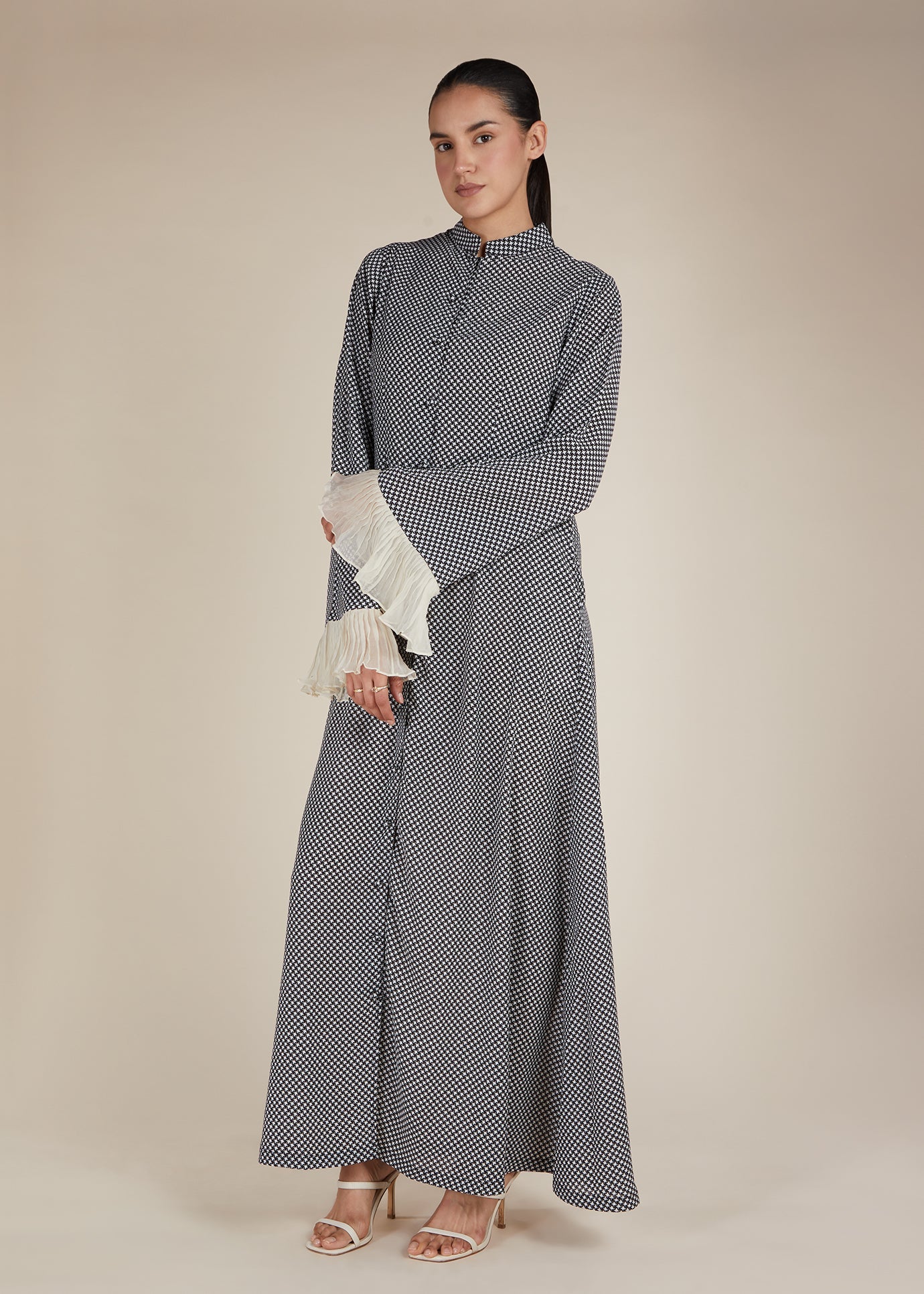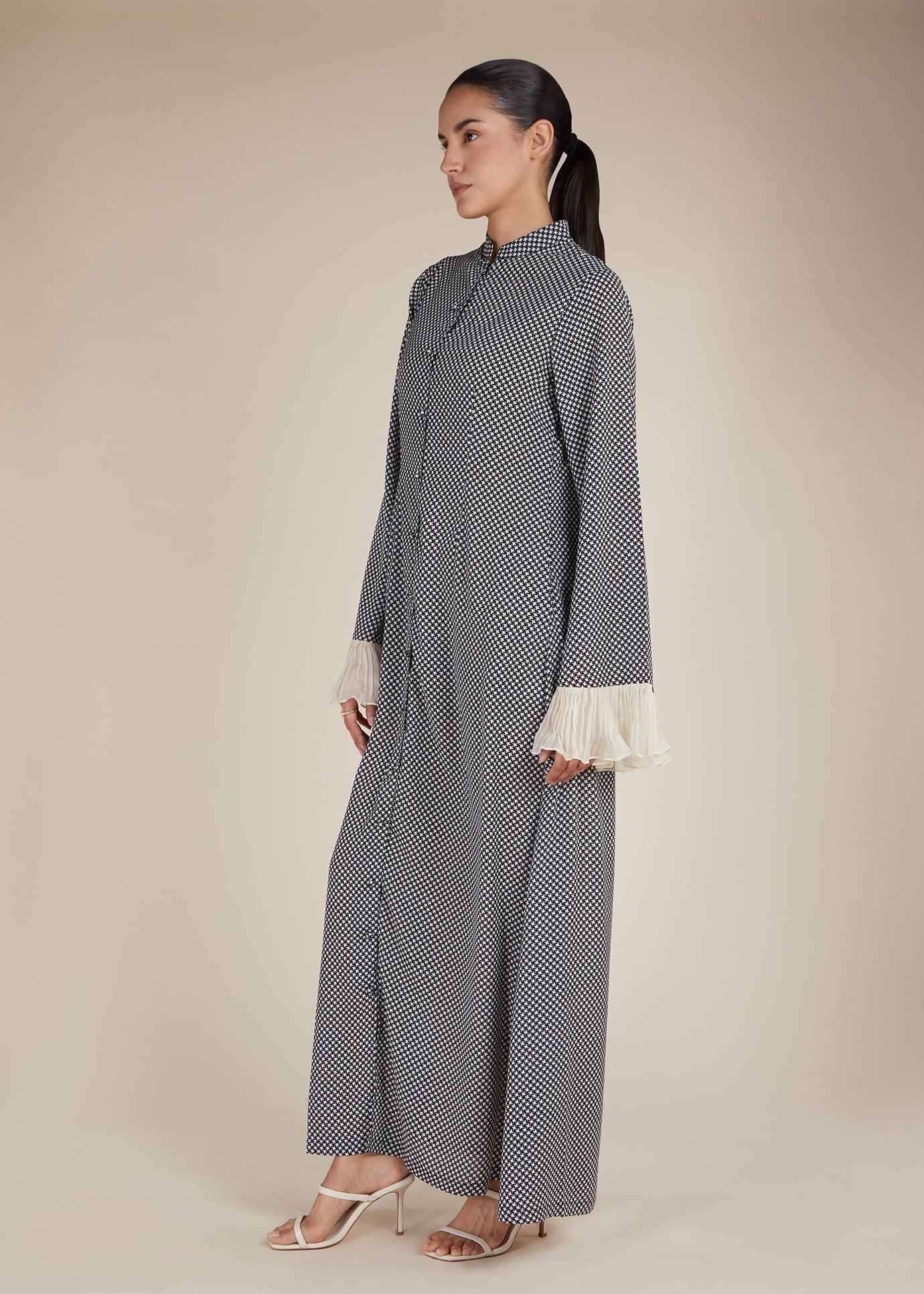 A fresh twist on a classic silhouette, this printed garment makes a bold yet graceful statement. Featuring a refined high collar, full button-down front with covered fabric buttons, and signature pleated contrast cuffs, this piece pairs contemporary detailing with timeless modest style. Side pockets add a practical finish to this versatile wardrobe essential