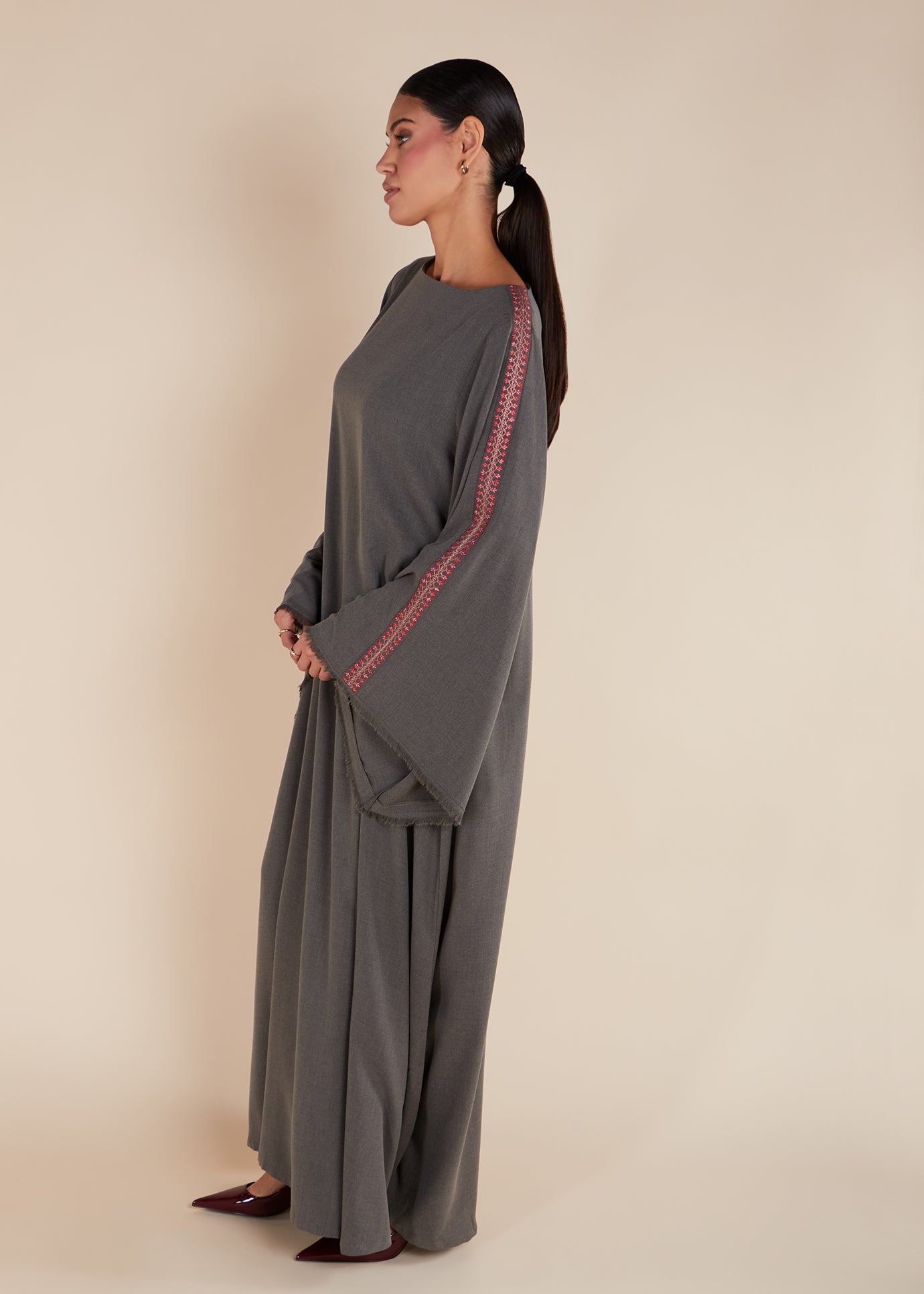 This Saffron Abaya has a flowy and comfortable fit in a gentle grey fabric that mimics the qualities of wool. Its standout feature is the vibrant embroidery on the sleeves, depicting shades of saffron. Designed with a relaxed silhouette and dramatic wide sleeves, the edges of the sleeves are finished with fringes.