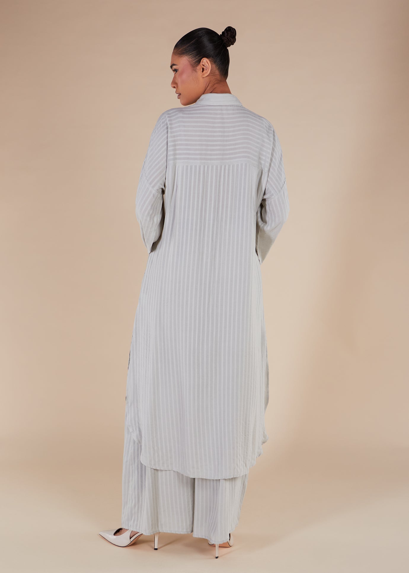 A light and airy co-ord set designed for warm and sunny days - featuring a longer dress-style shirt and mid-flare trousers, this outfit is ideal for weekend outings or your vacation wardrobe. Please take note that the fabric is lightweight with a subtle self-print and may be slightly sheer. We suggest wearing skin-coloured underwear or a tank top underneath for the best coverage.