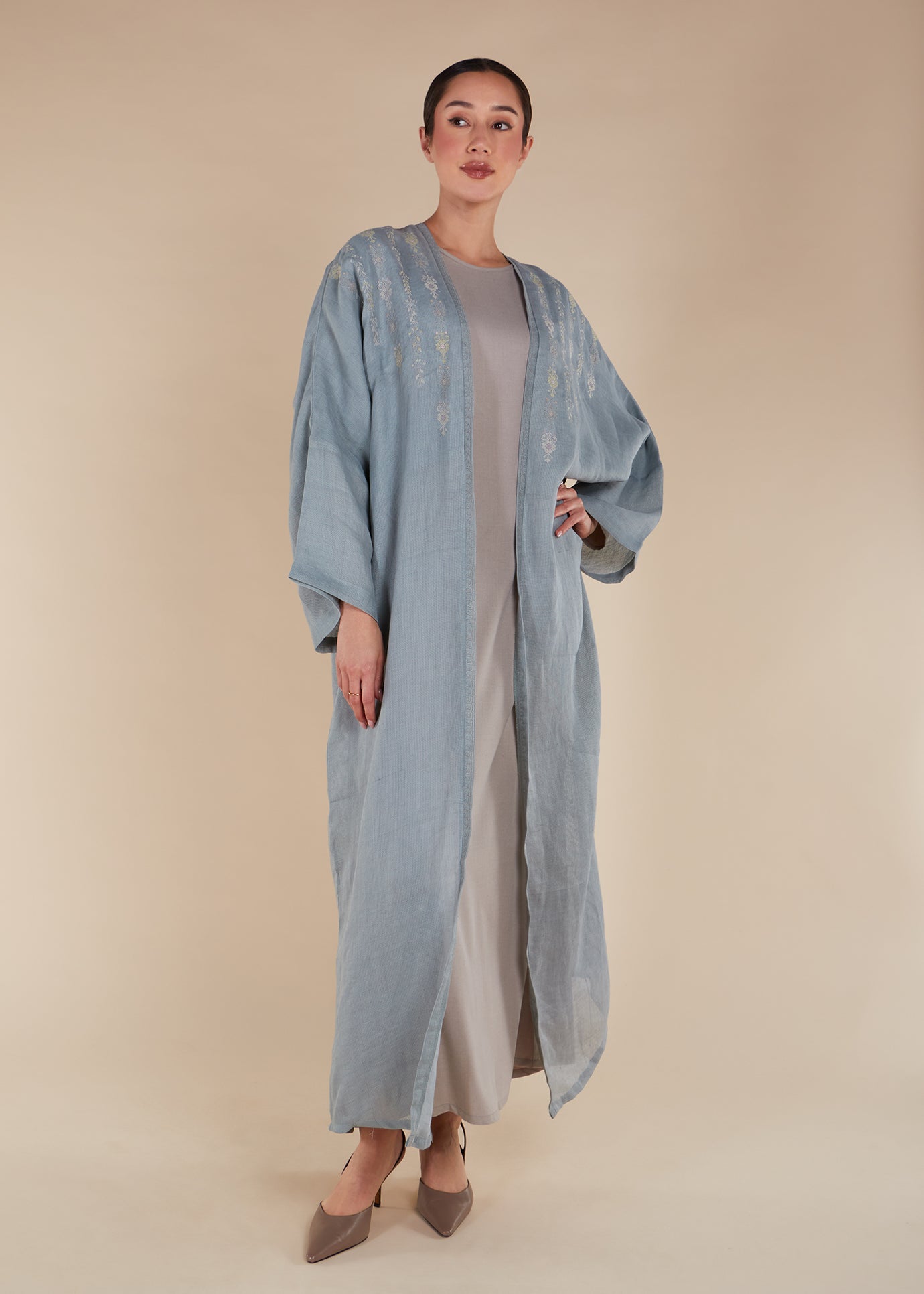 This Abaya has intricate Tatreez style embroidery on the front and back, as well as along the placket. With a soft sage shade and a cotton jute fabric, it has a subtly structured appearance. For a complete look, pair it with one of our slips.