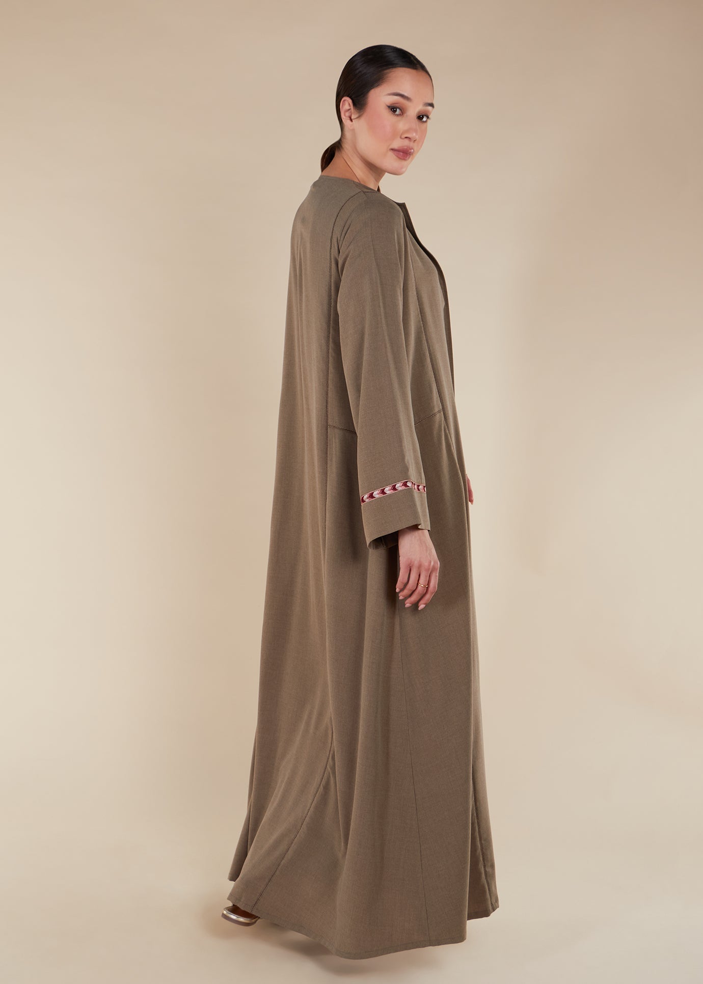 The Sahm Open Abaya features a loose fit silhouette, with a thin embroidered strip with elegant lace details creating panels. This understated piece is versatile and can be thrown over jeans or formal wear to instantly elevate your look or pair with the matching slip for a head-to-toe elegant ensemble.
