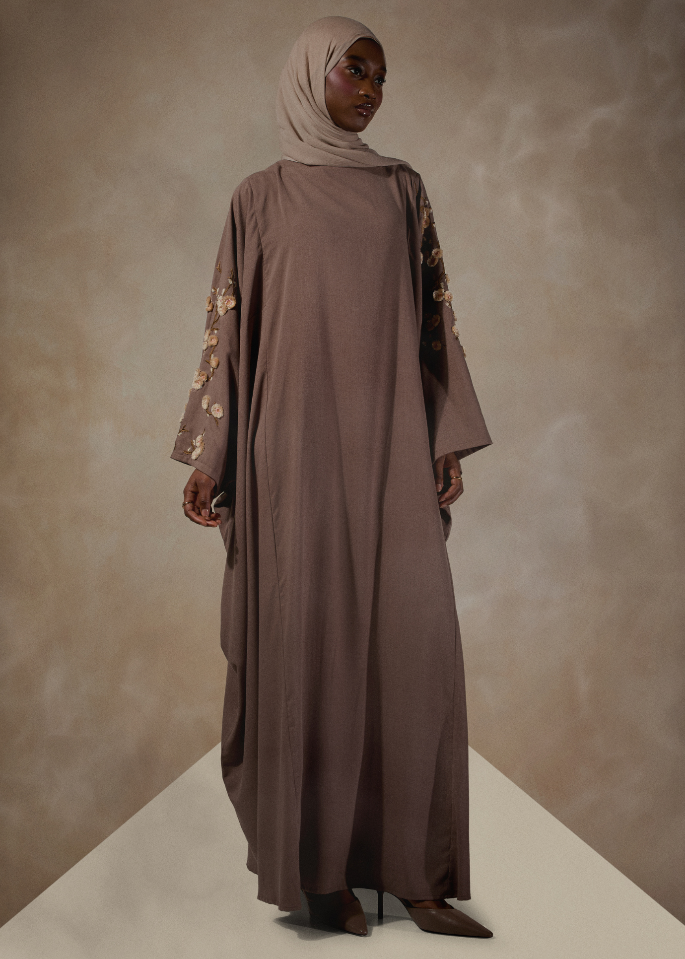 Cut in a timeless silhouette with dramatic elegance, Our Sakura Kaftan features embroidered flowers with a 3D effect lifting off the garment. The garment is in a bisque toned soft fabric with complimentary tonal flowers. Loose fitting yet elegant.