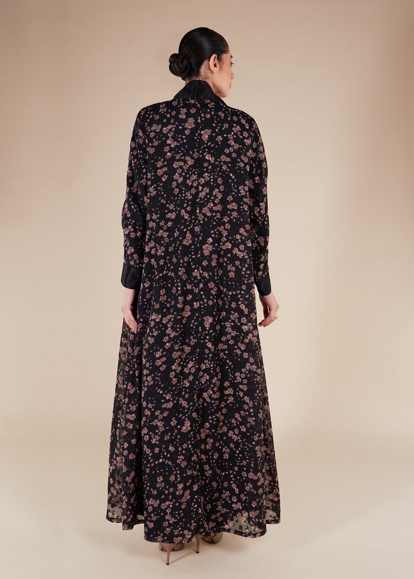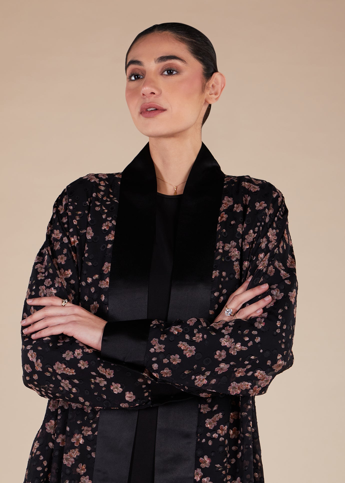 The Sakura Kimono includes a satin placket and cuffs in black and is made from a slightly textured fabric. Its elegant design features a beautiful floral pattern and can be complemented with our selection of slips for a complete look.