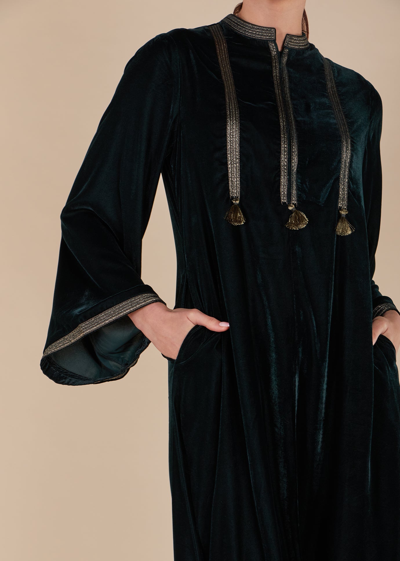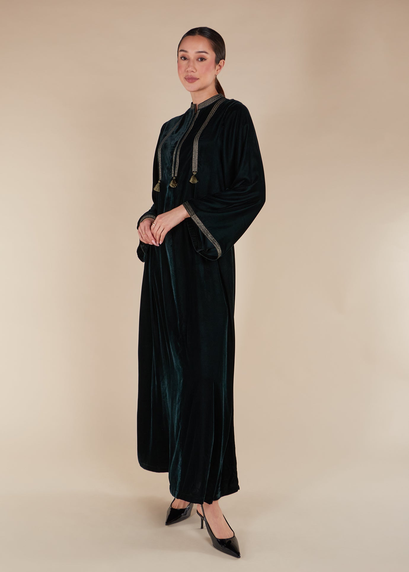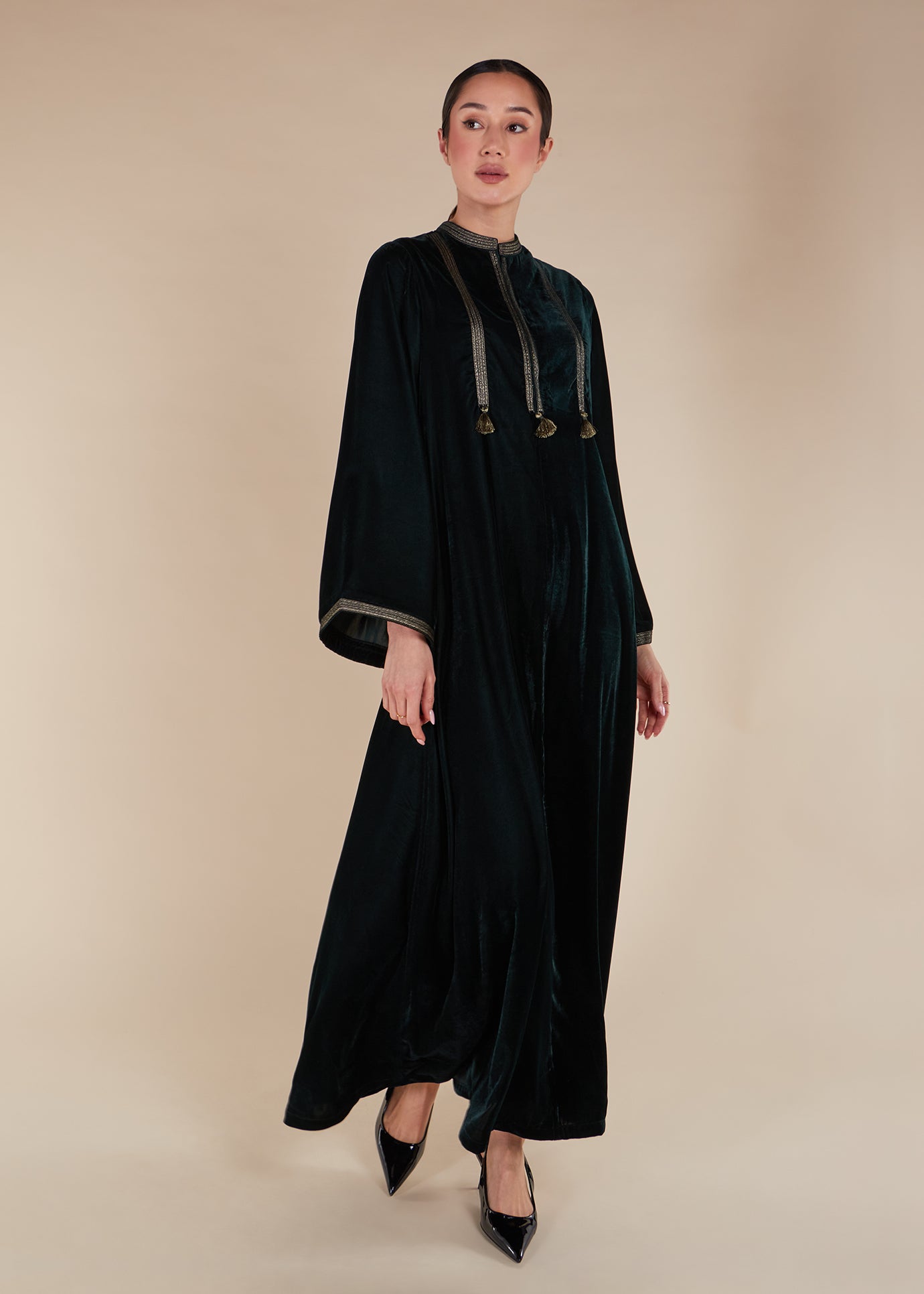 This is an elegant, full-length velvet abaya designed with timeless sophistication. The high-neck collar is accented with metallic trim and tassel-tipped ties, adding a refined and unique touch. The flowing silhouette, combined with wide sleeves and luxurious velvet, makes it ideal for formal occasions or evening wear.