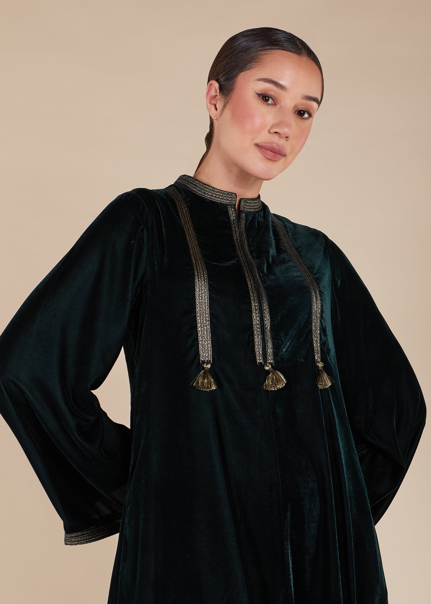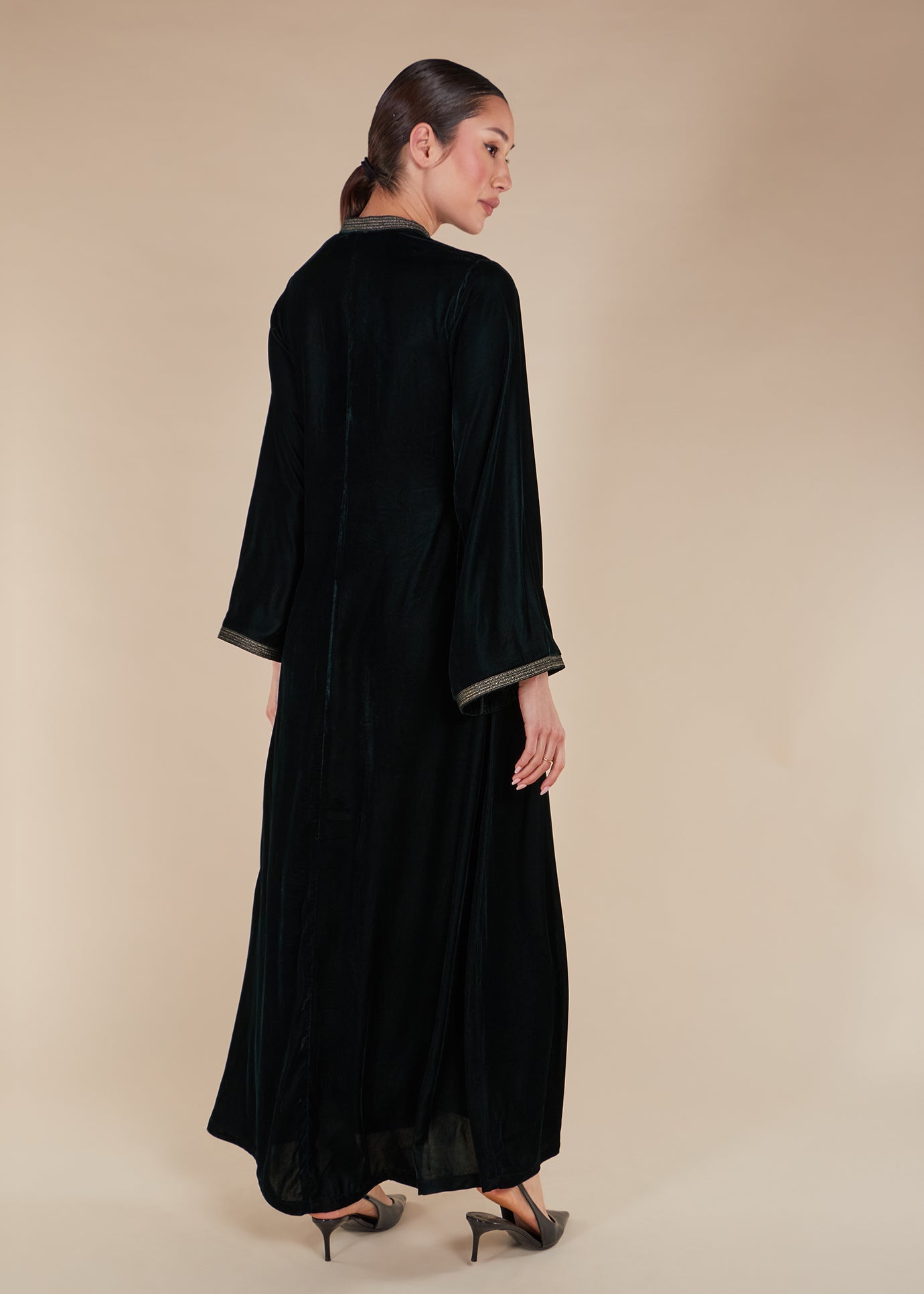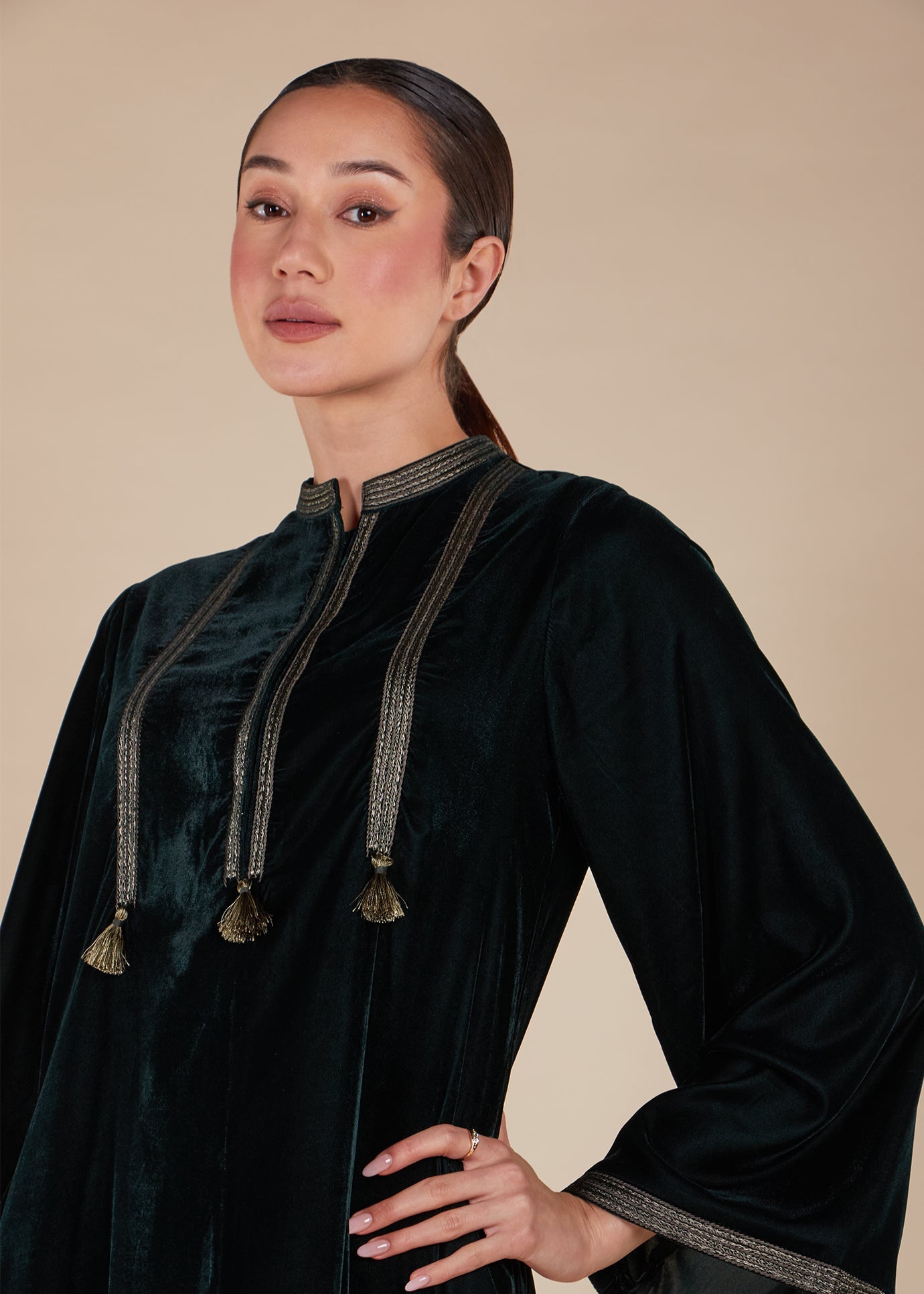 This is an elegant, full-length velvet abaya designed with timeless sophistication. The high-neck collar is accented with metallic trim and tassel-tipped ties, adding a refined and unique touch. The flowing silhouette, combined with wide sleeves and luxurious velvet, makes it ideal for formal occasions or evening wear.