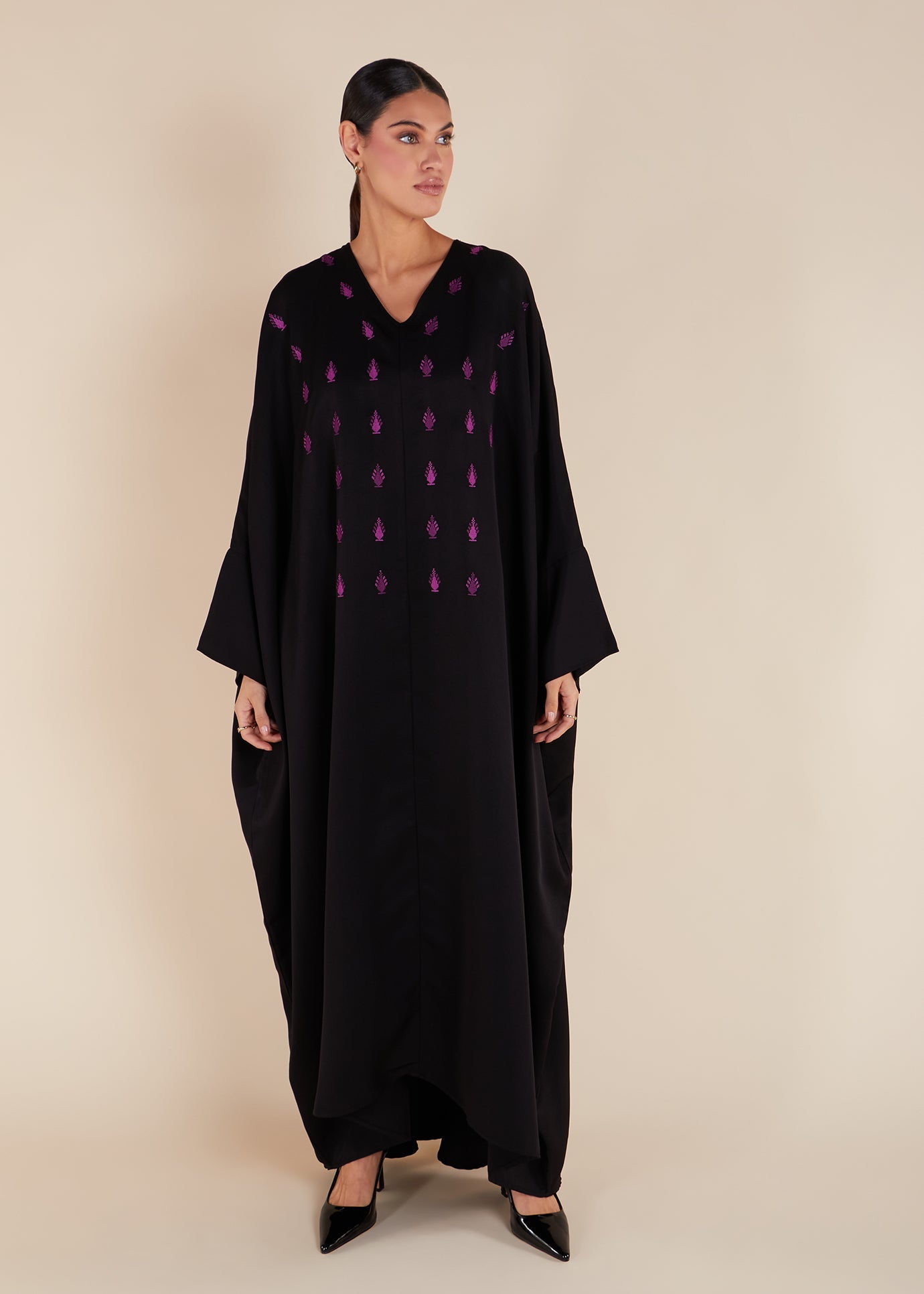 The Sarwa Kaftan boasts a stunning traditional Tatreez style embroidery on its front, featuring bold pink motifs on a fluid black fabric. Its loose, oversized fit is perfect for both Ramadan occasions and as a classic kaftan style for special events. The kaftan also includes small side slits, a front seam, and a single button at the back, while offering a V-neck and full sleeves.