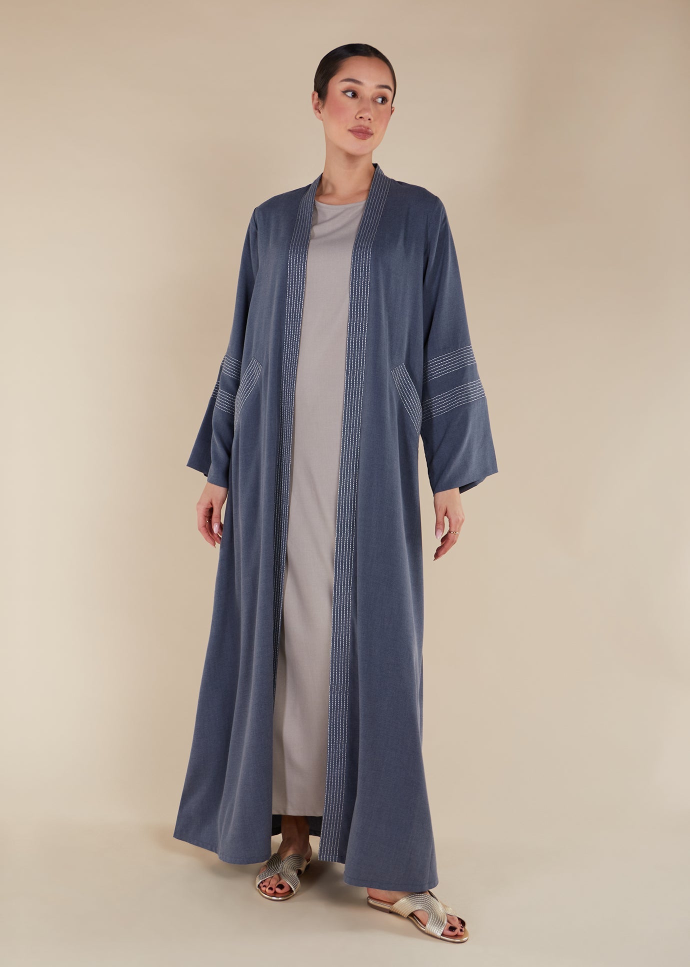 This classy Sashiko Open Abaya has traditional embroidery on the cuffs, placket, and pocket area, with a stunning contrast of white stitches on a denim blue shade. Made with durability in mind, this elegant piece can be worn season after season. For a complete look, pair it with an off-white slip, or dress it down with jeans and a white t-shirt.