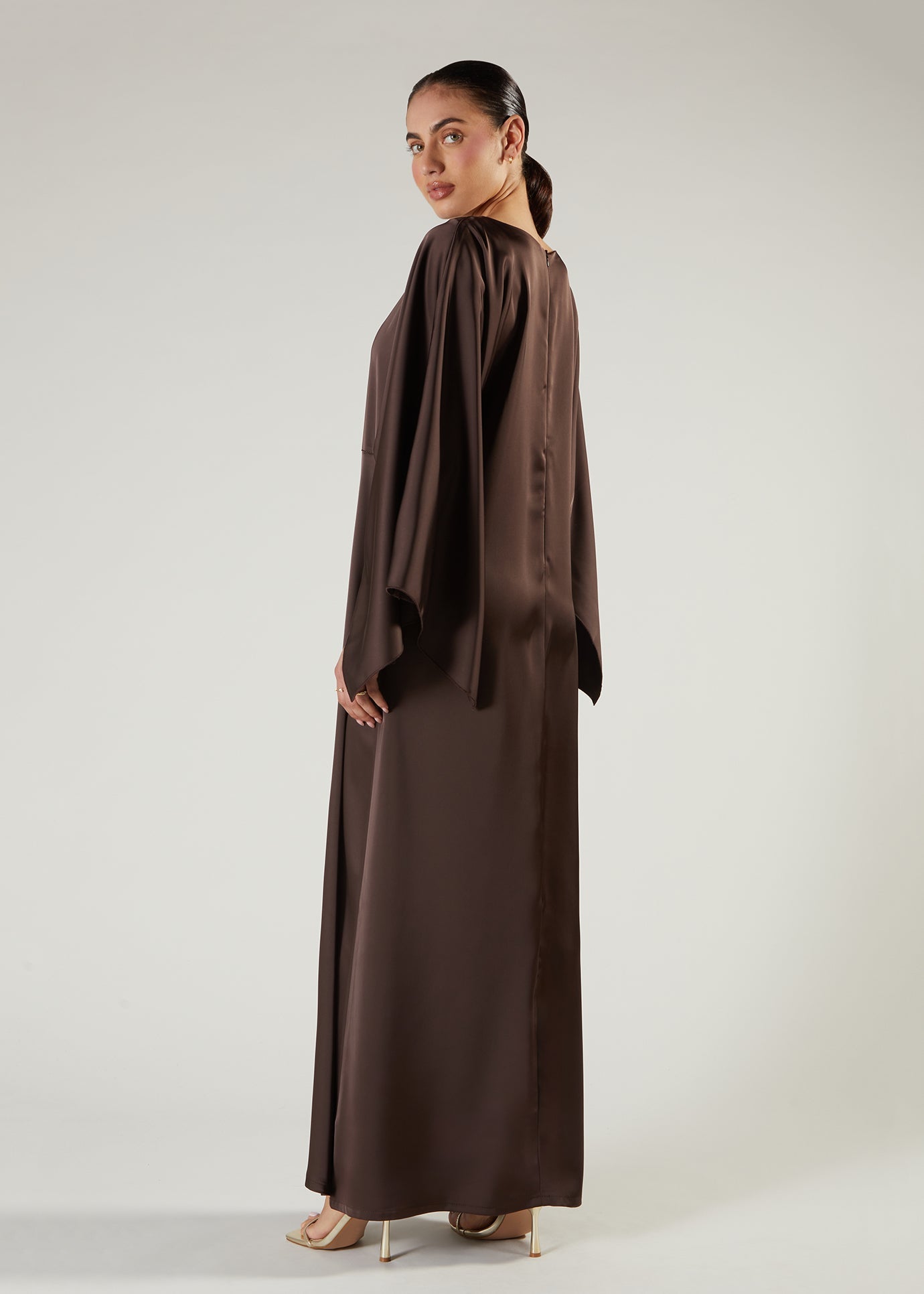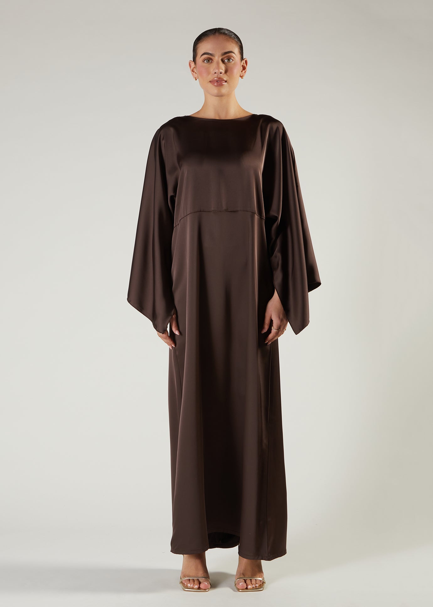 A fluid satin Abaya in a rich regal green shade, has loose fitting sleeves and a floaty modest silhouette.