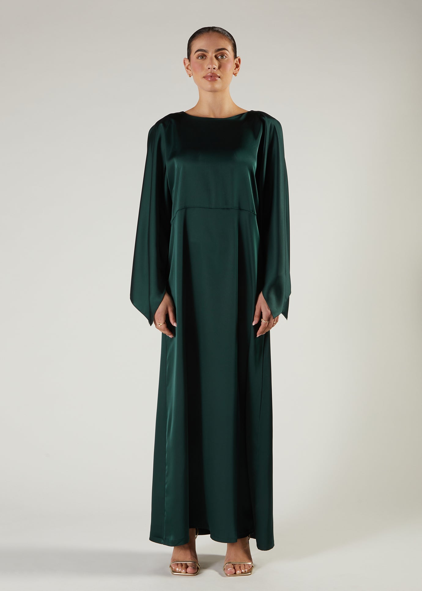 A fluid satin Abaya in a rich regal green shade, has loose fitting sleeves and a floaty modest silhouette.