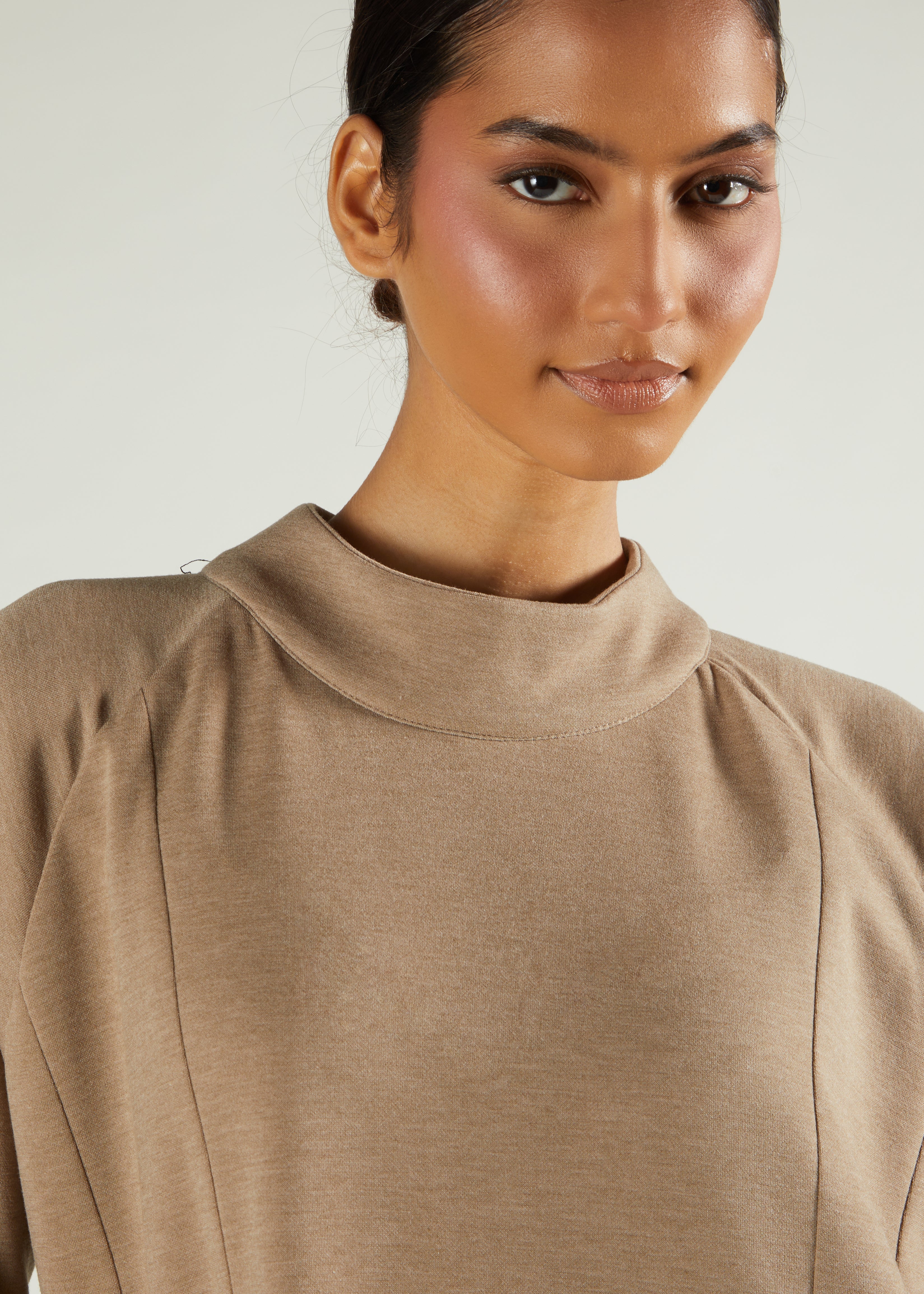 An everyday Abaya in mid-weight fabric with panelling, pockets, and a raised neckline for cooler seasons.