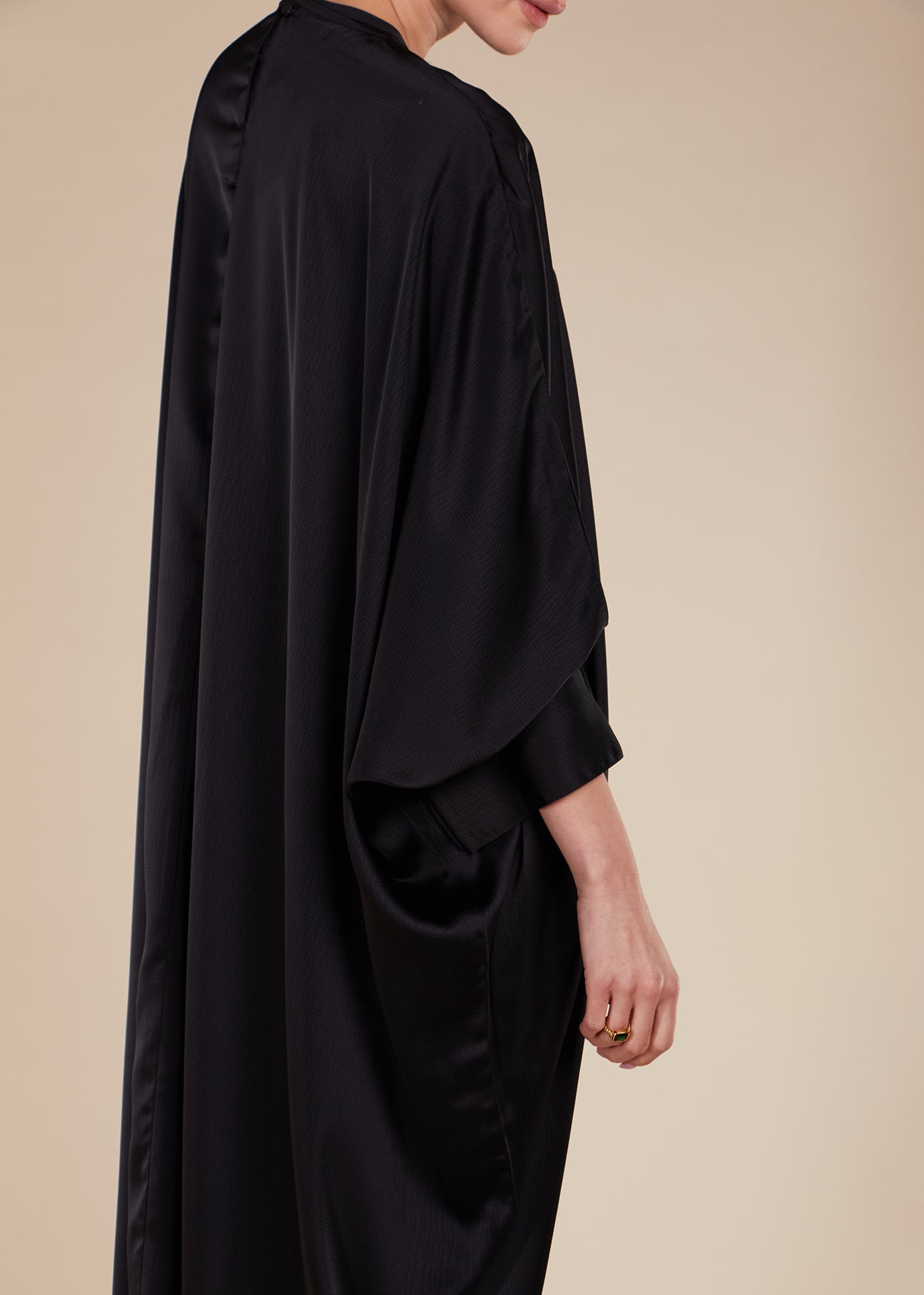 The Self Print Kaftan is made from a satin self-print fabric with a slightly heavier weight, creating a fluid and comfortable loose fit. This versatile kaftan features a round neckline, cuffed sleeves, and a discreet opening at the back. For a chic and elevated look, pair it with gold accessories. Perfect for any occasion.
