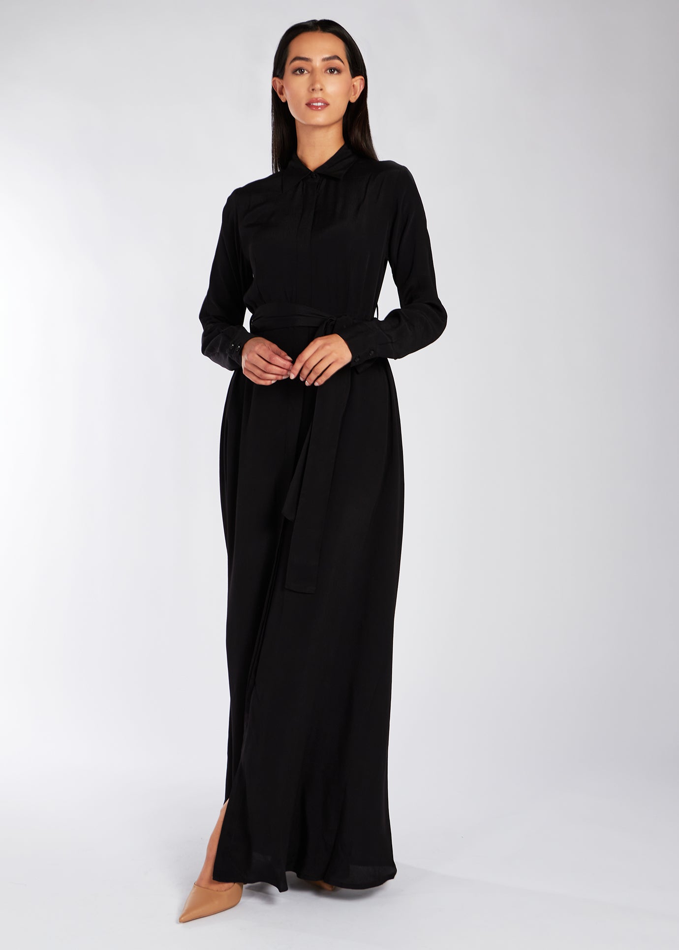 Elevate your look with the Shirted Maxi Black. Whether dressed up or down, this timeless piece offers a full button-down design, standard collars with discreet side pockets in an elegant fabric with a subtle sheen for a sophisticated finish.