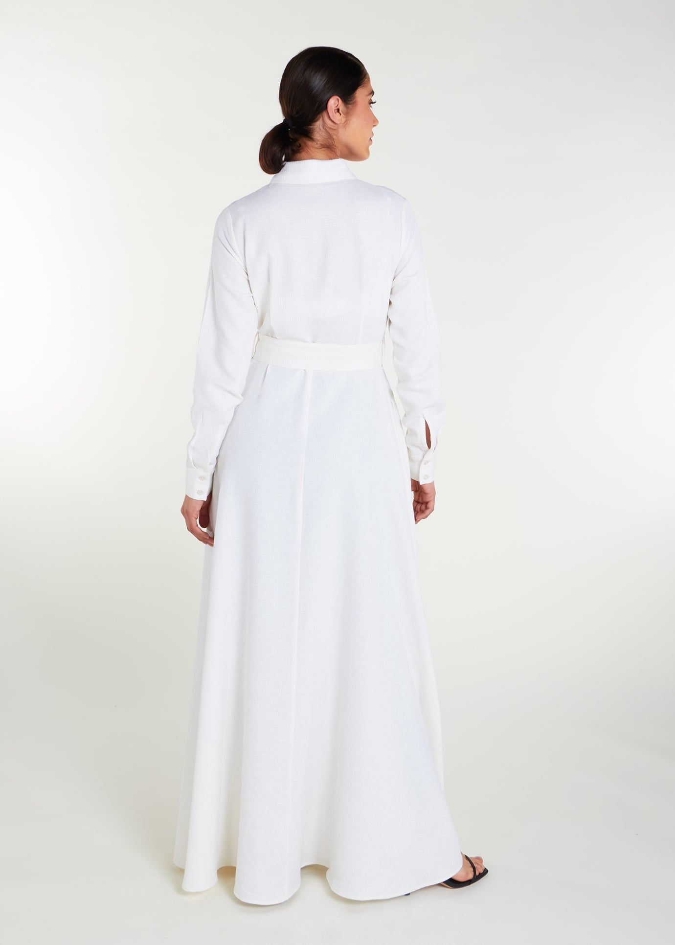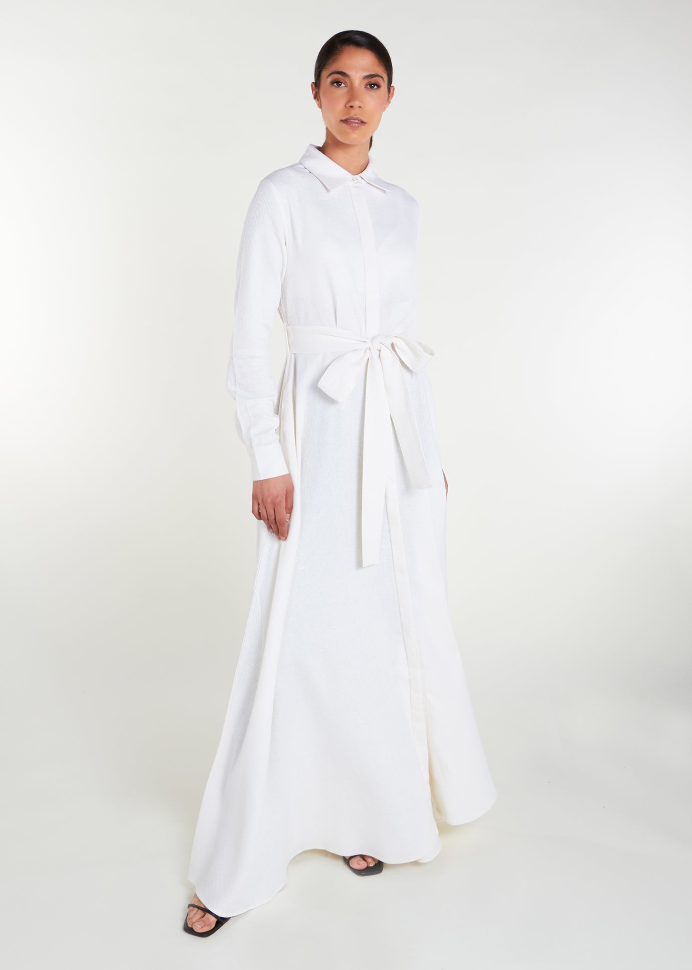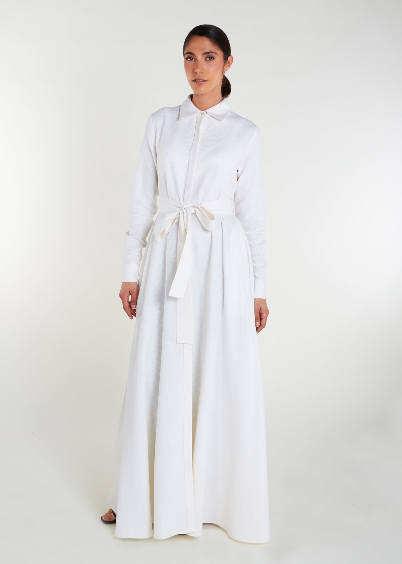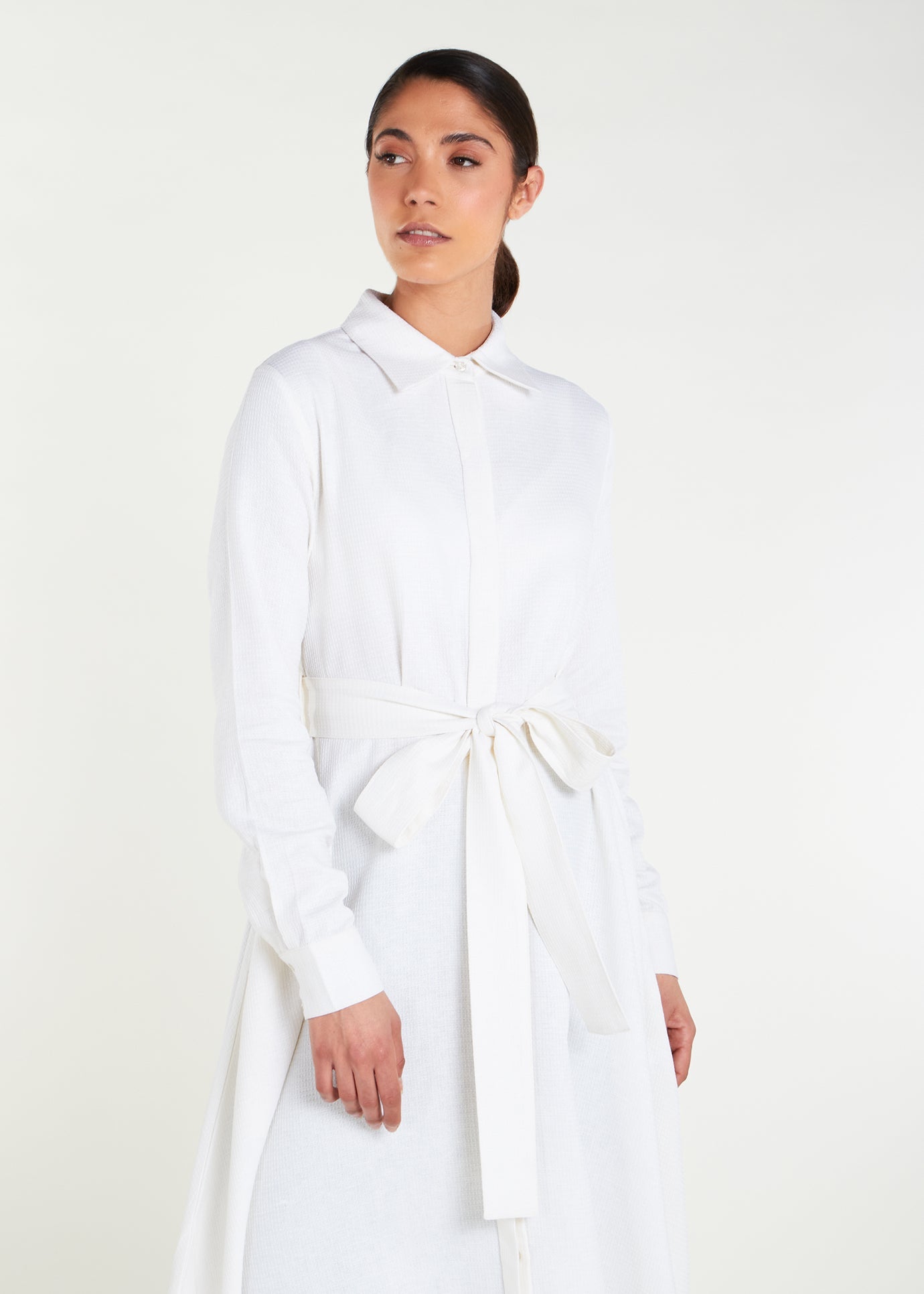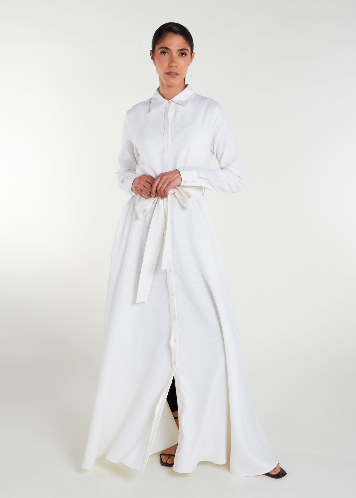 Elevate your look with the Shirted Maxi White. Whether dressed up or down, this timeless piece offers a full button down design, standard collars with discreet side pockets in an elegant fabric with a subtle sheen for a sophisticated finish.