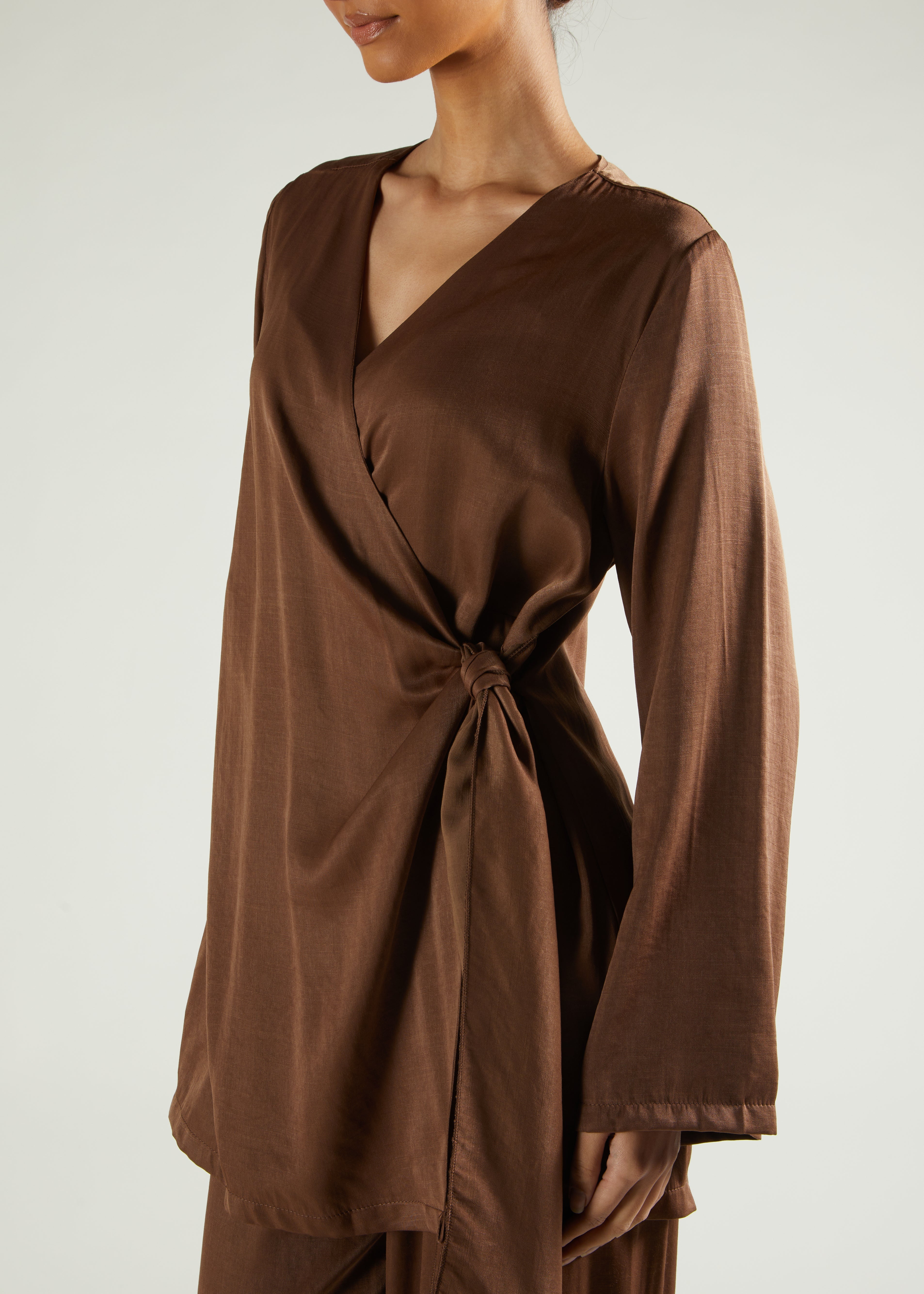 An elegant evening set featuring a shimmering side-tie top and tailored trousers with a modest fit. Layer with our Second Skin collection for additional neckline coverage if preferred. Complete with statement jewellery for a polished look.
