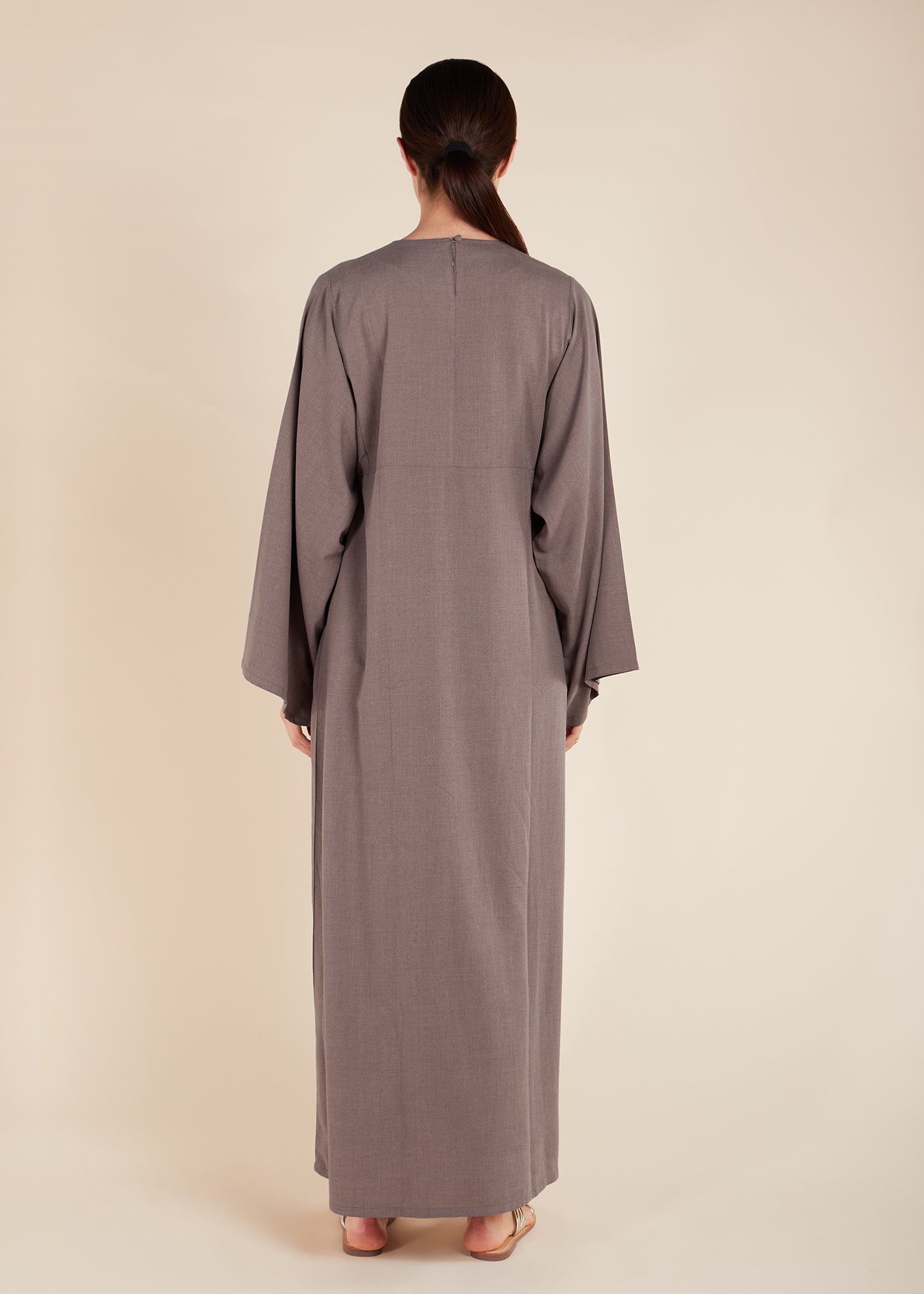 This Simple Seam Abaya Coffee features a loose fit, wide sleeves, and subtle pleats on the waistline. It also includes a back neckline slit with a self-fabric button for opening.