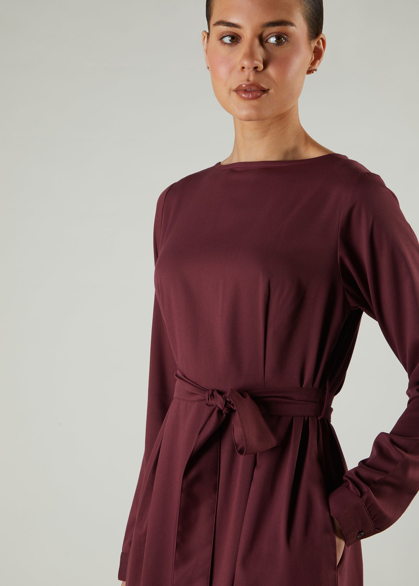 The fabric drapes beautifully and features subtle pleats around the waist, accentuating the look for this garment. Also features a round neckline, discreet side pockets and a zip opening at the back.