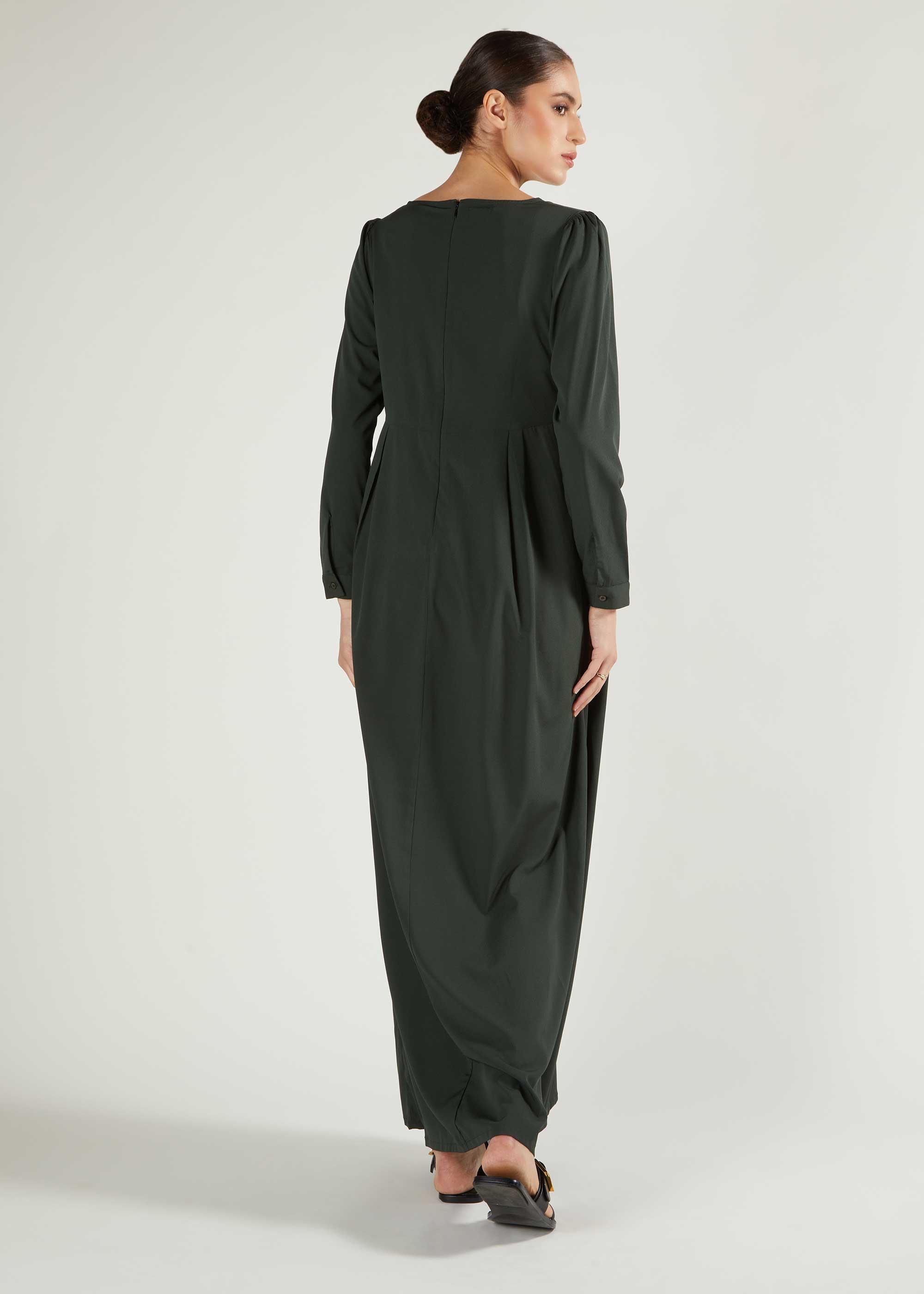 This abaya showcases a tailored waist with pleats for an elegant, skirt-inspired silhouette. It is a refined piece suitable for wearing alone or layered with a Kimono or Open Abaya. The design includes a discreet zip at the back and practical side pockets for added functionality.