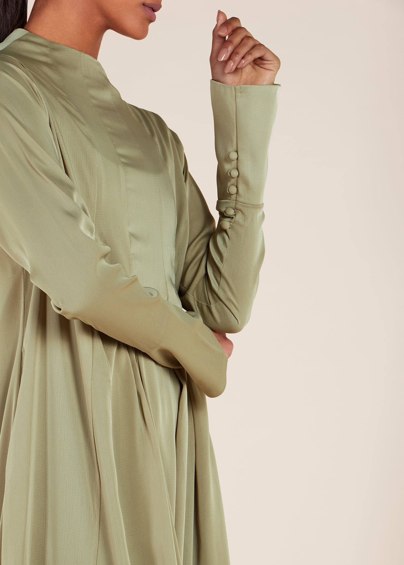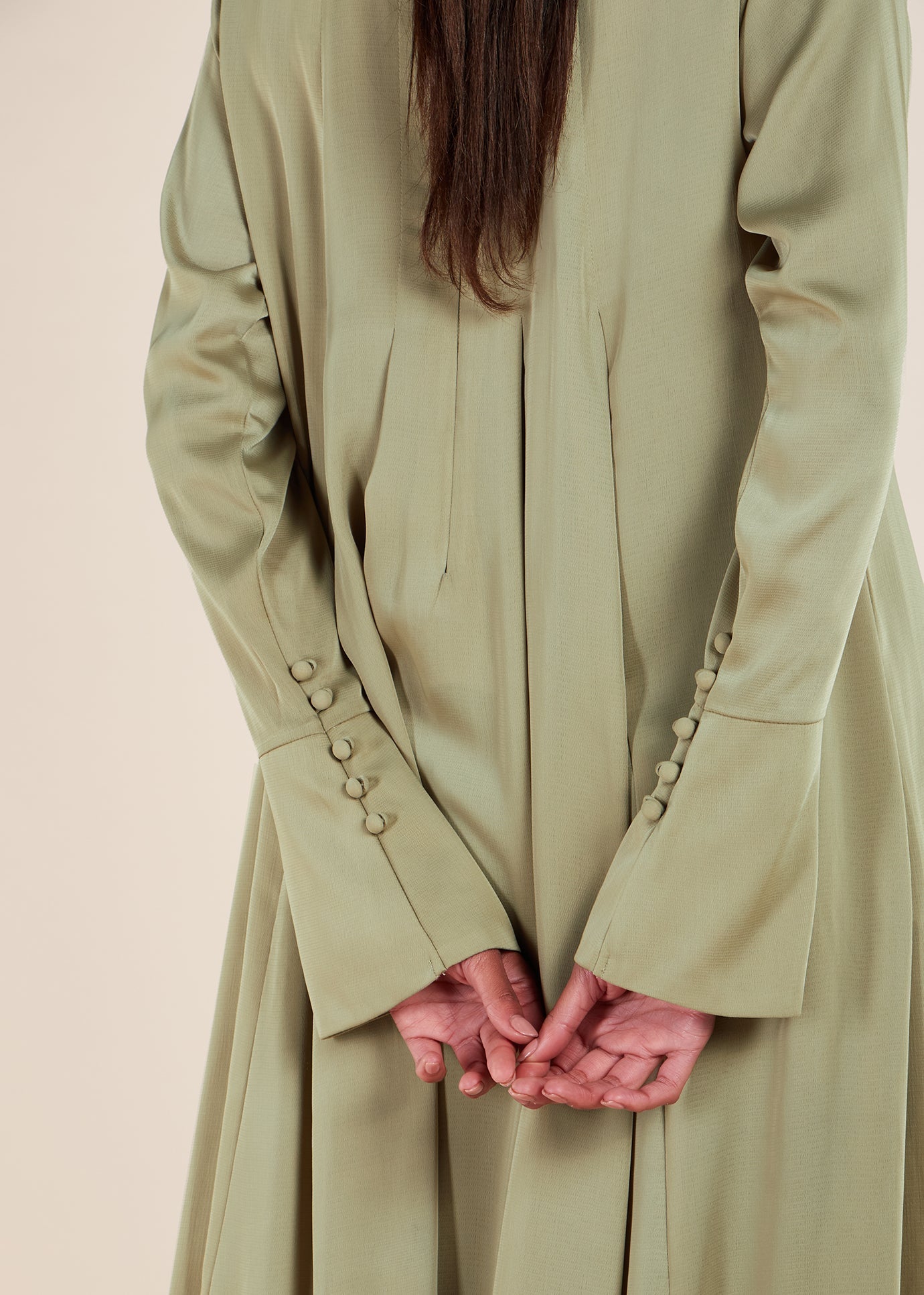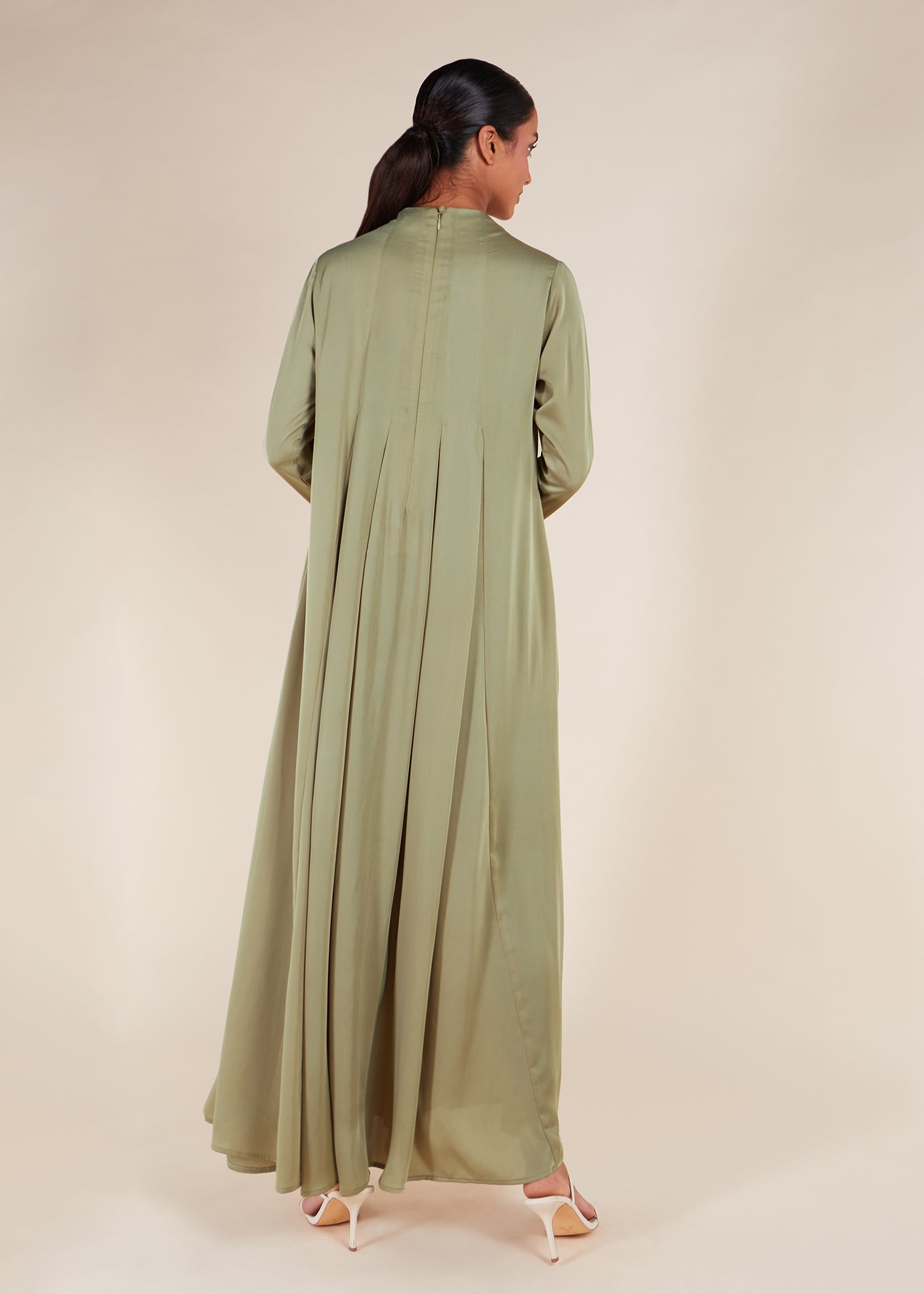 This satin abaya combines fluid elegance with clean tailoring. Defined by its structured high neckline and full-length pleats that flow from the shoulders down, the silhouette offers graceful movement with every step. Tapered sleeves finished with fabric-covered buttons at the cuffs add a refined touch, while the invisible zip at the back ensures a seamless fit. Finished with discreet side pockets, this piece balances simplicity with thoughtful detail.