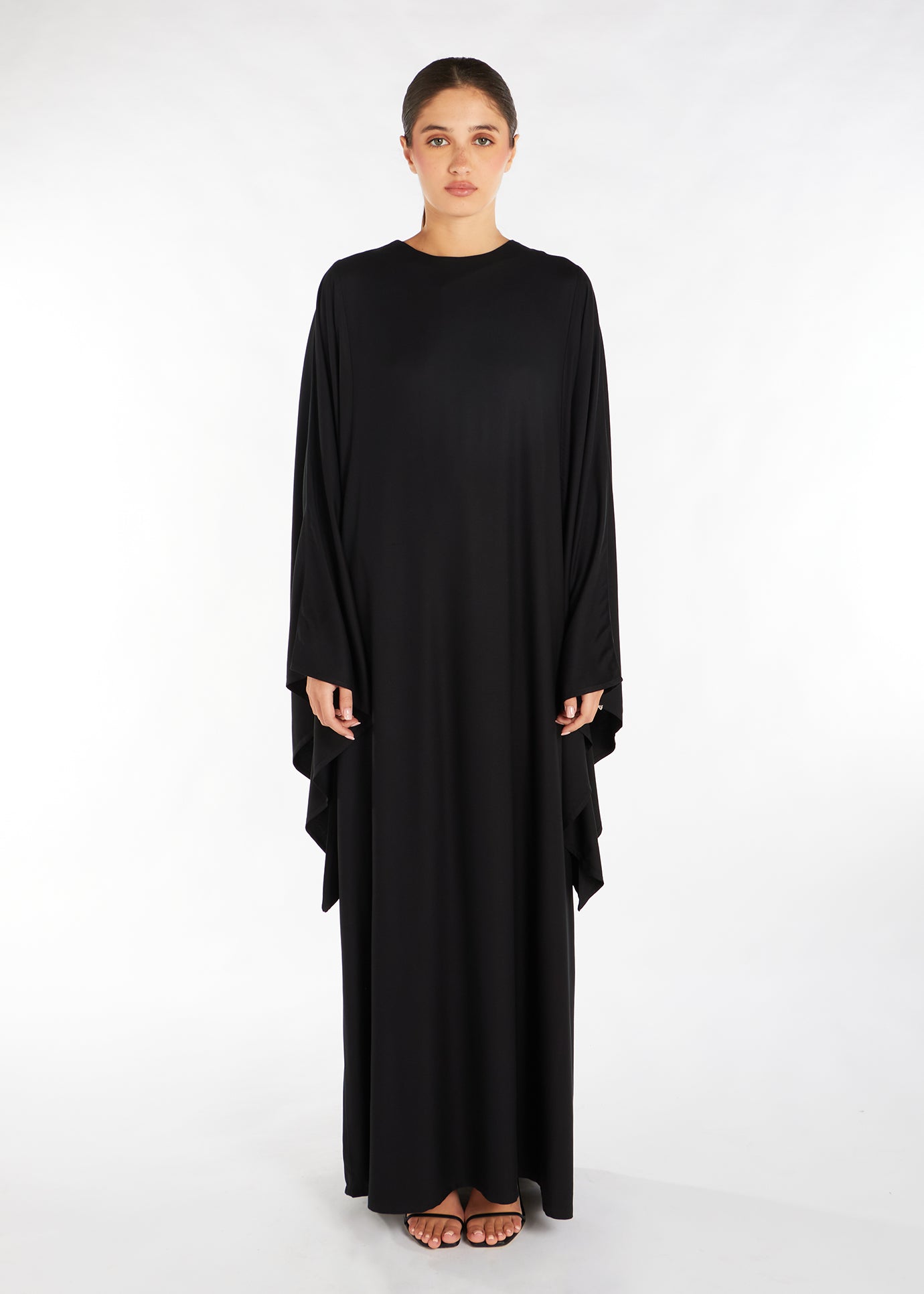 This flowy modest cut Abaya with exaggerated sleeves is perfect for both evening soirees and prayer outfits.