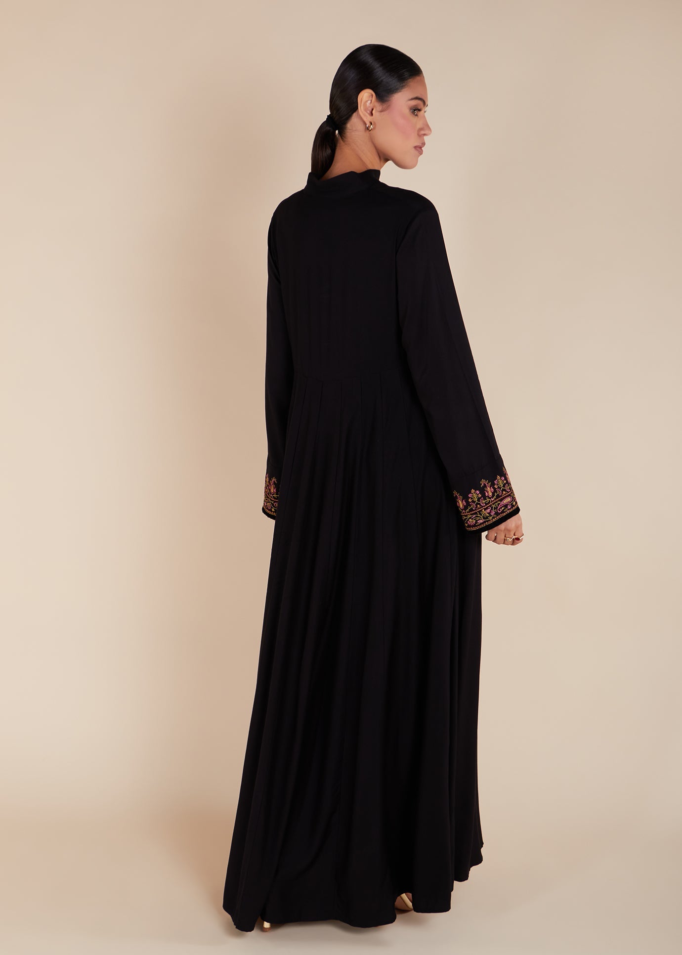 This exquisite Abaya features traditional Sozni embroidery on the cuffs, incorporating hints of earthy greens. The luxurious velvet trim adds a touch of sophistication to this stunning garment, completed with delicately hand-embroidered buttons. The vibrant embroidery on this soft black twill fabric makes it the perfect outfit for special occasions, eliminating the need for additional accessories.