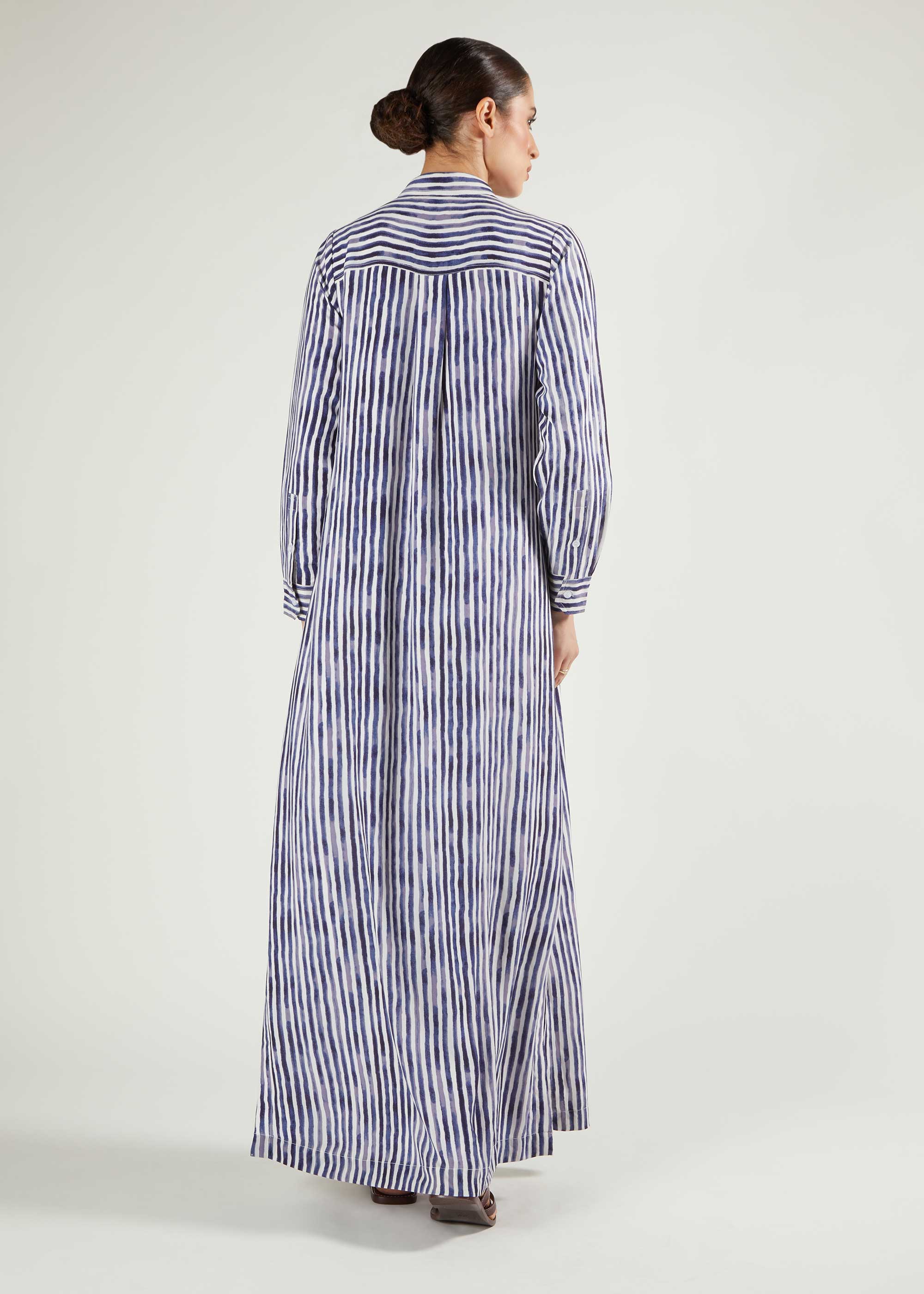 The long-style maxi shirt has a classic nautical stripe design, making it ideal for both professional settings and holiday wardrobes. It includes traditional collars, cuffed sleeves, subtle side pockets, and short side slits for added comfort and style.