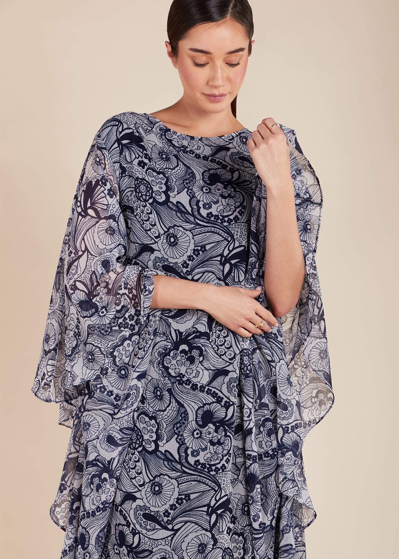 The Sumi Maxi Dress has a floaty kaftan silhouette and is fully lined, except for the sleeves. Its striking artistic print adds a bold and beautiful touch, making it ideal for any special occasion.