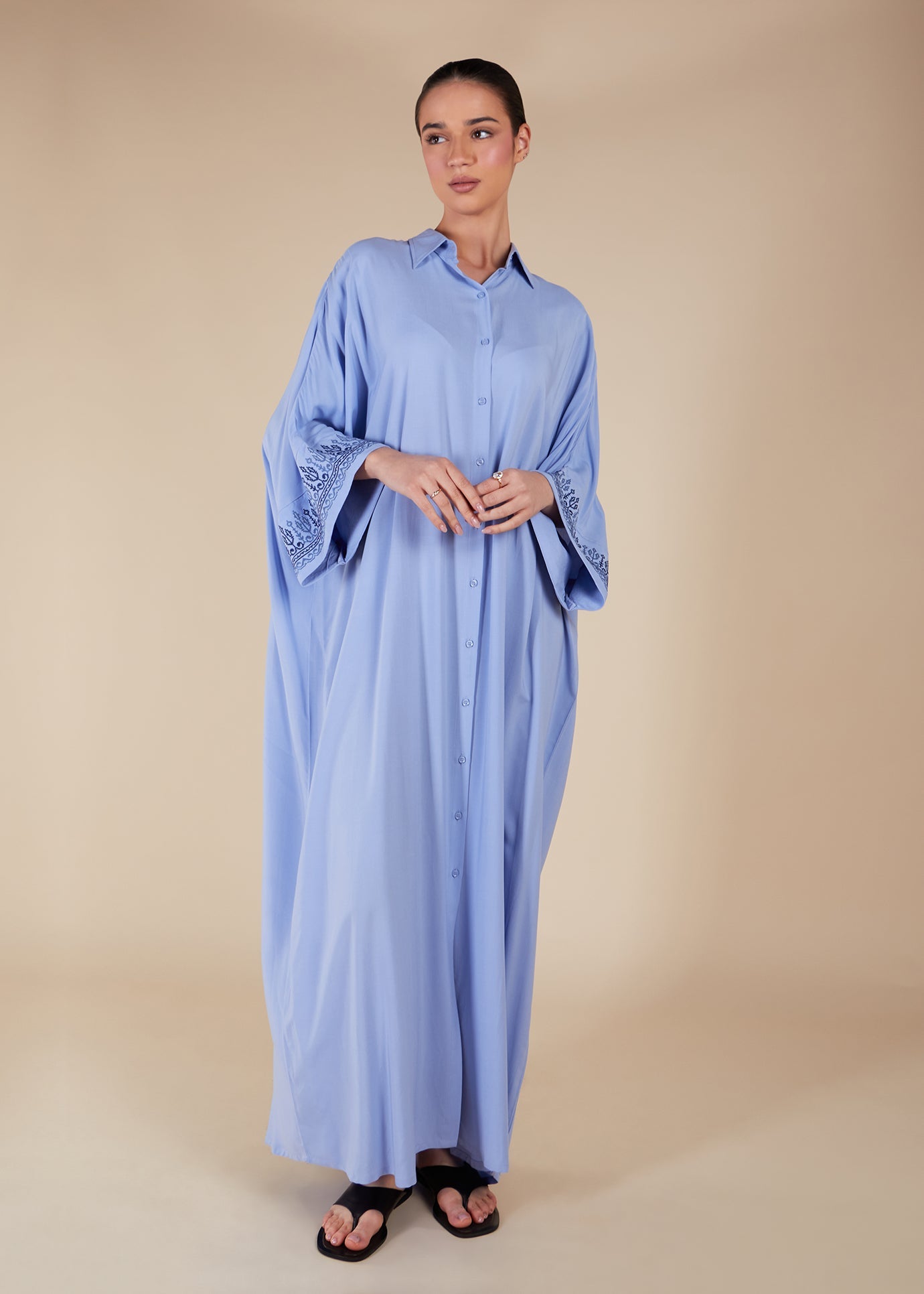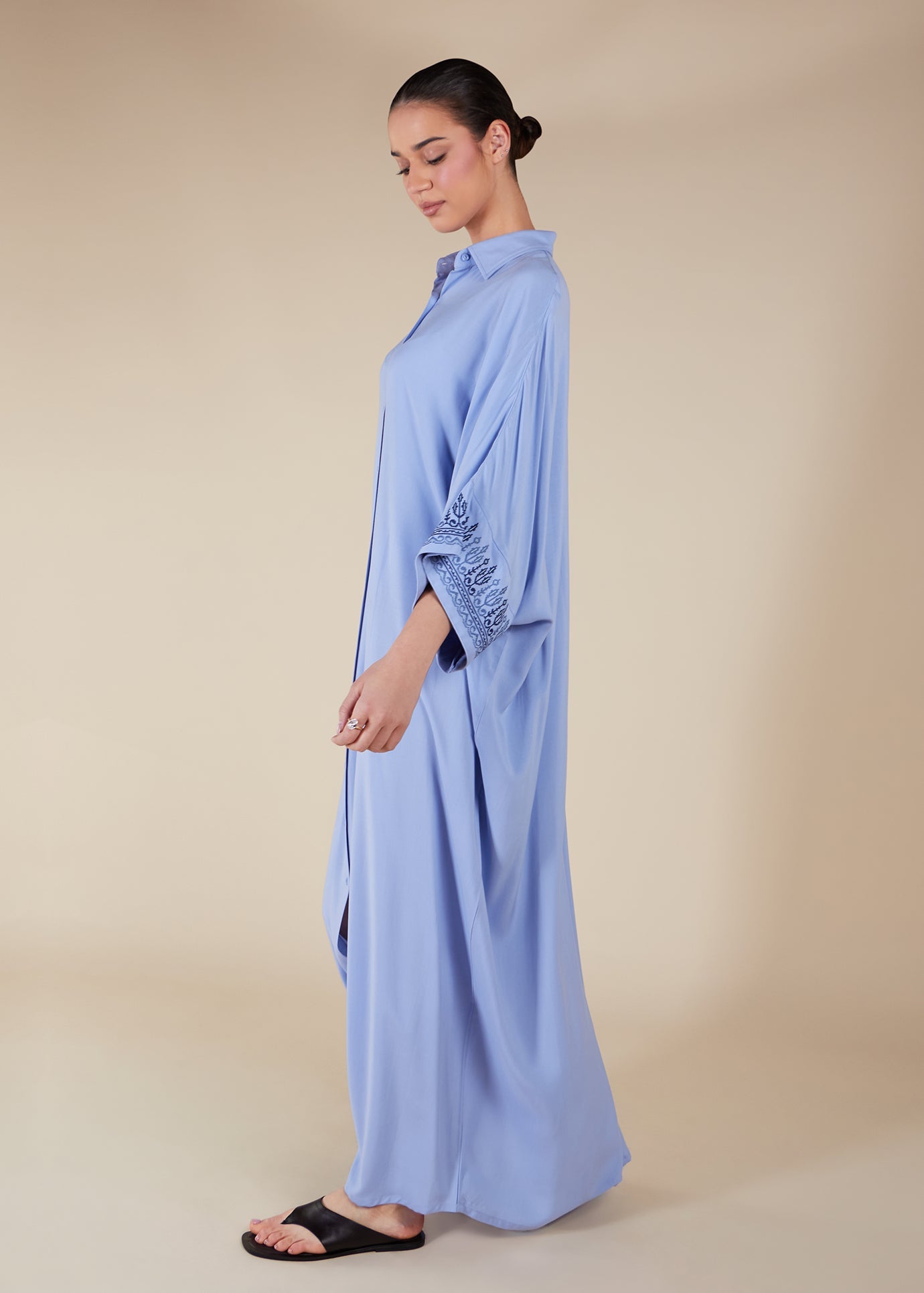 This sky-blue cotton summer kaftan has a loose fit and is ideal for casual gatherings. Its elegant tonal embroidery on the cuffs adds a touch of sophistication. With a front button opening and made from breathable cotton, it is perfect for summer days. For a more regular fit, please consider sizing down.