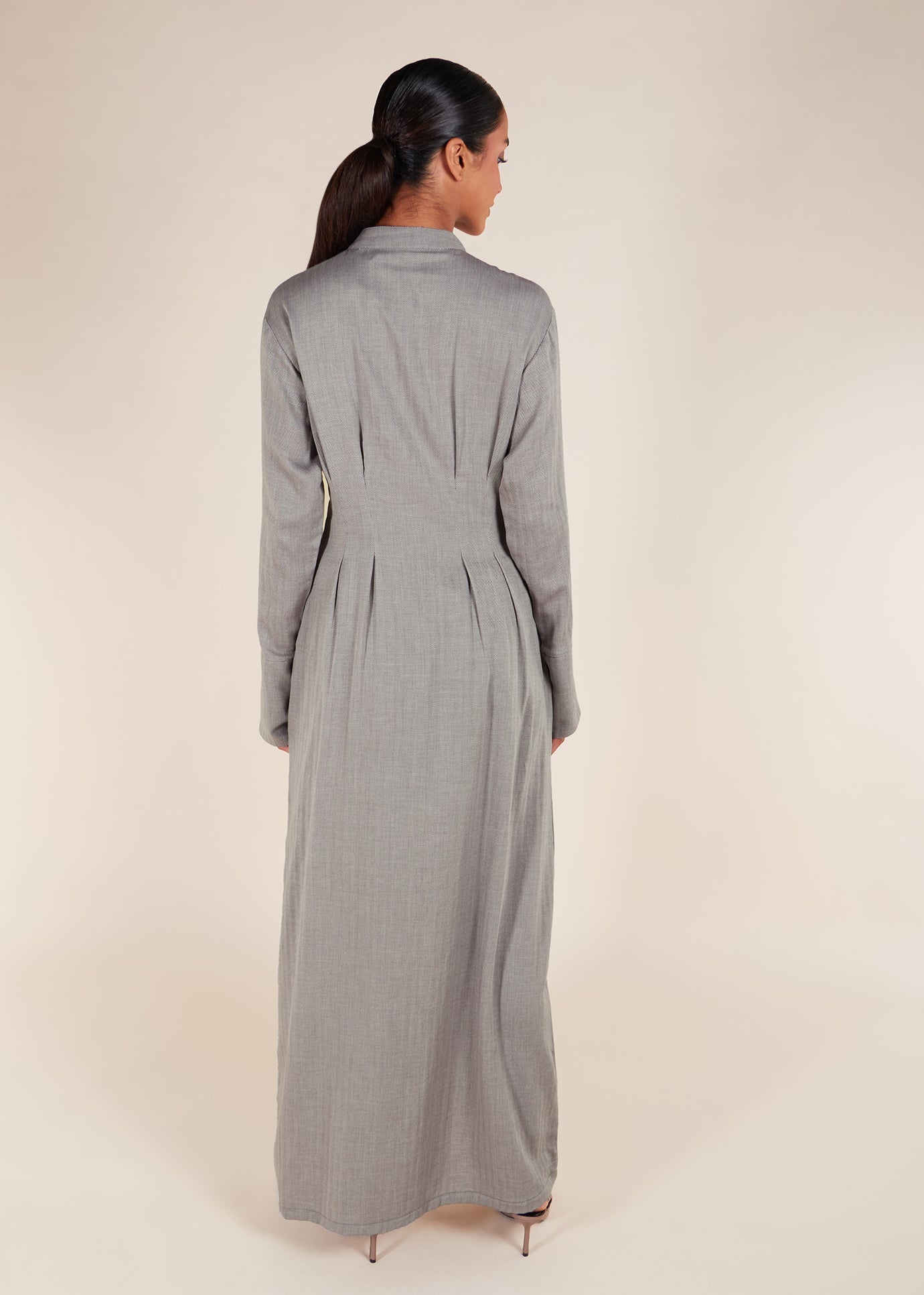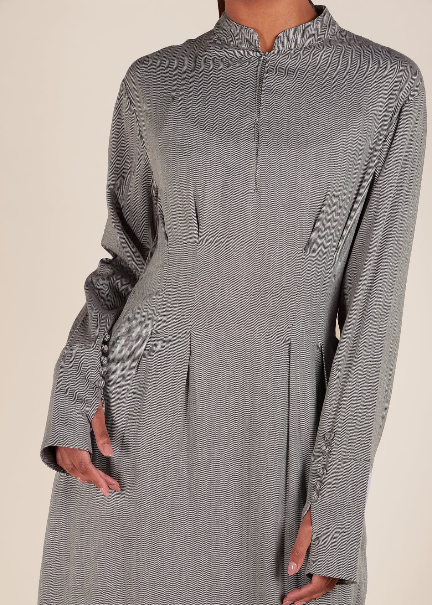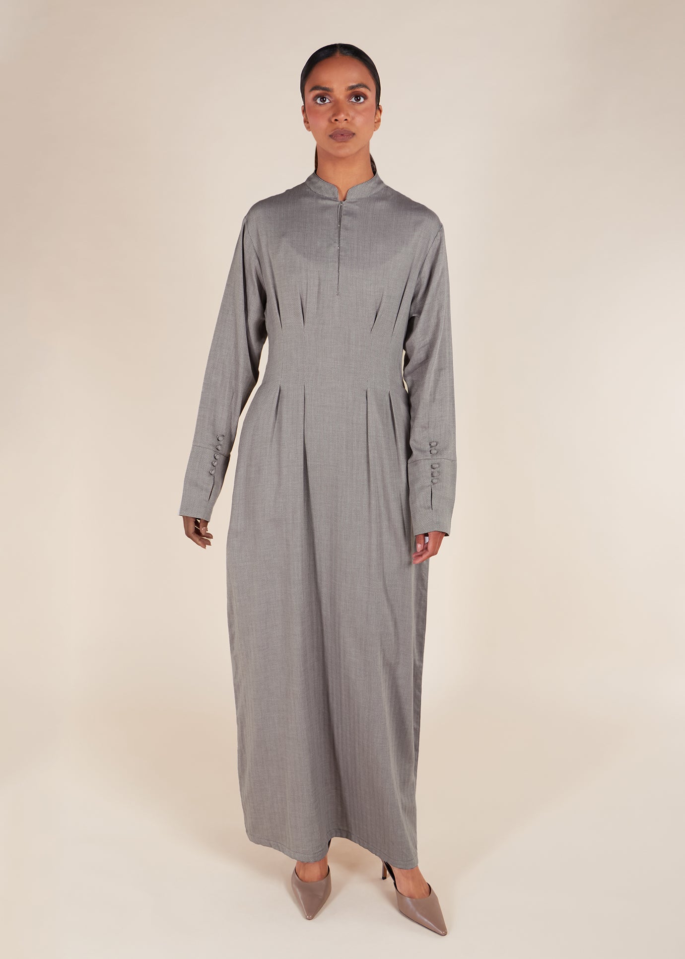A timeless silhouette reimagined in a refined herringbone weave, this Tweed-Style Maxi Dress offers the perfect balance of classic tailoring and everyday elegance. Featuring a mandarin collar, signature loop button detailing, and subtle pleating for a flattering shape, it’s finished with side pockets for ease and functionality
