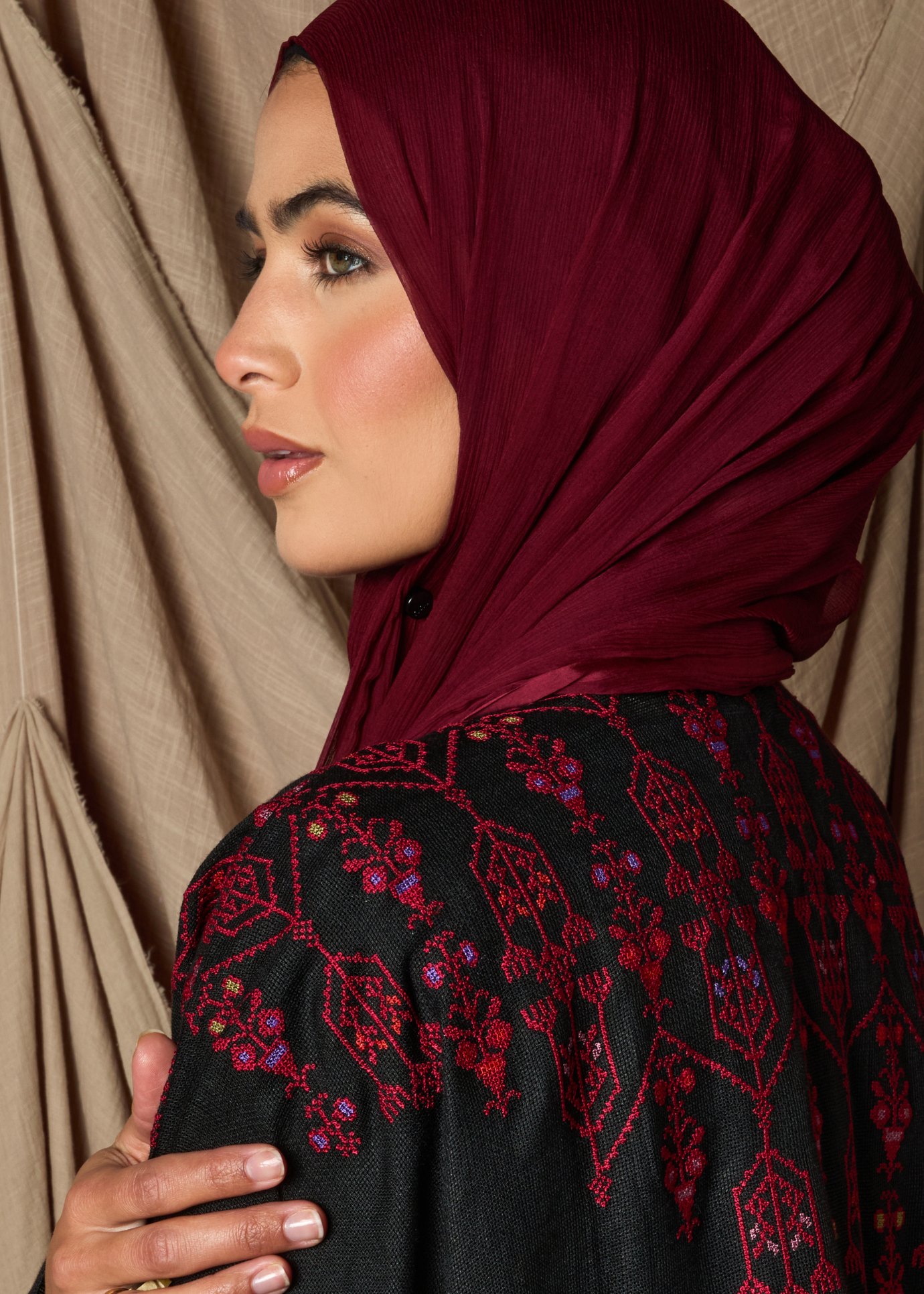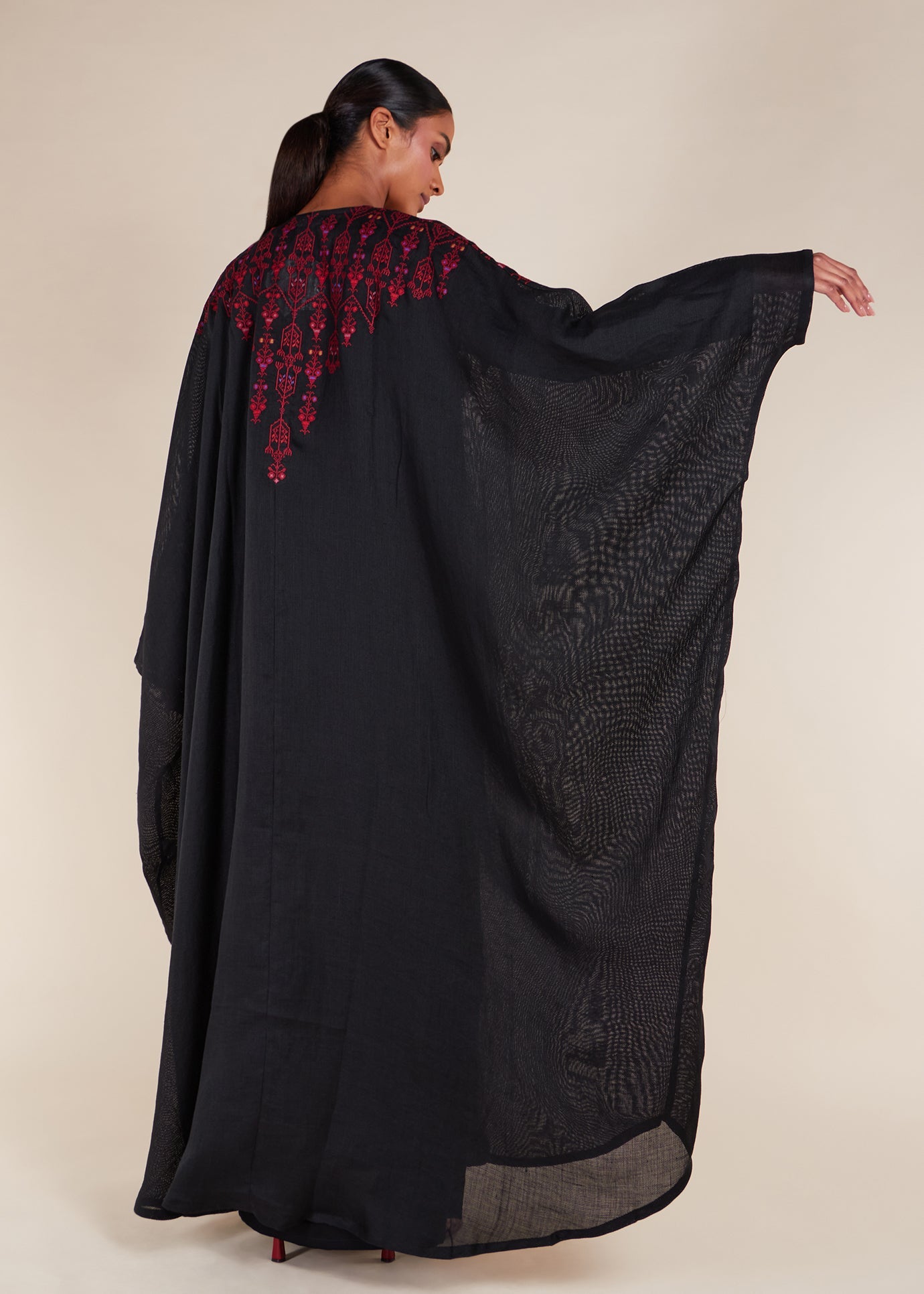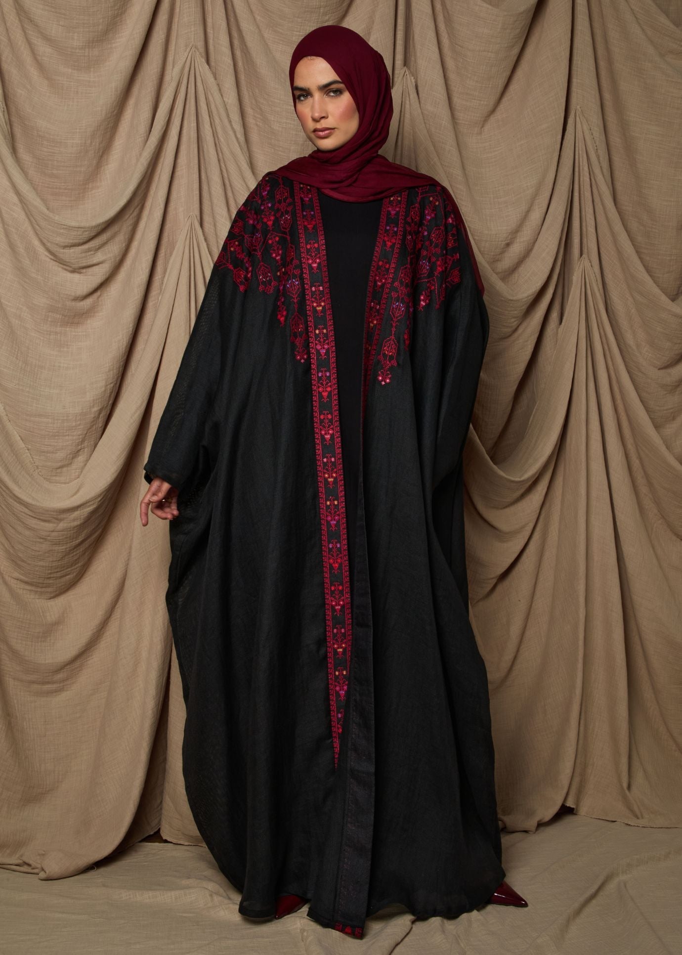 This open Abaya features a relaxed fit and is beautifully detailed with Tatreez embroidery on both the back and front bodice. Made from cotton jute fabric, it offers a breathable and comfortable wear despite its slightly heavier weight. We suggest pairing it with our selection of slips for the best look.