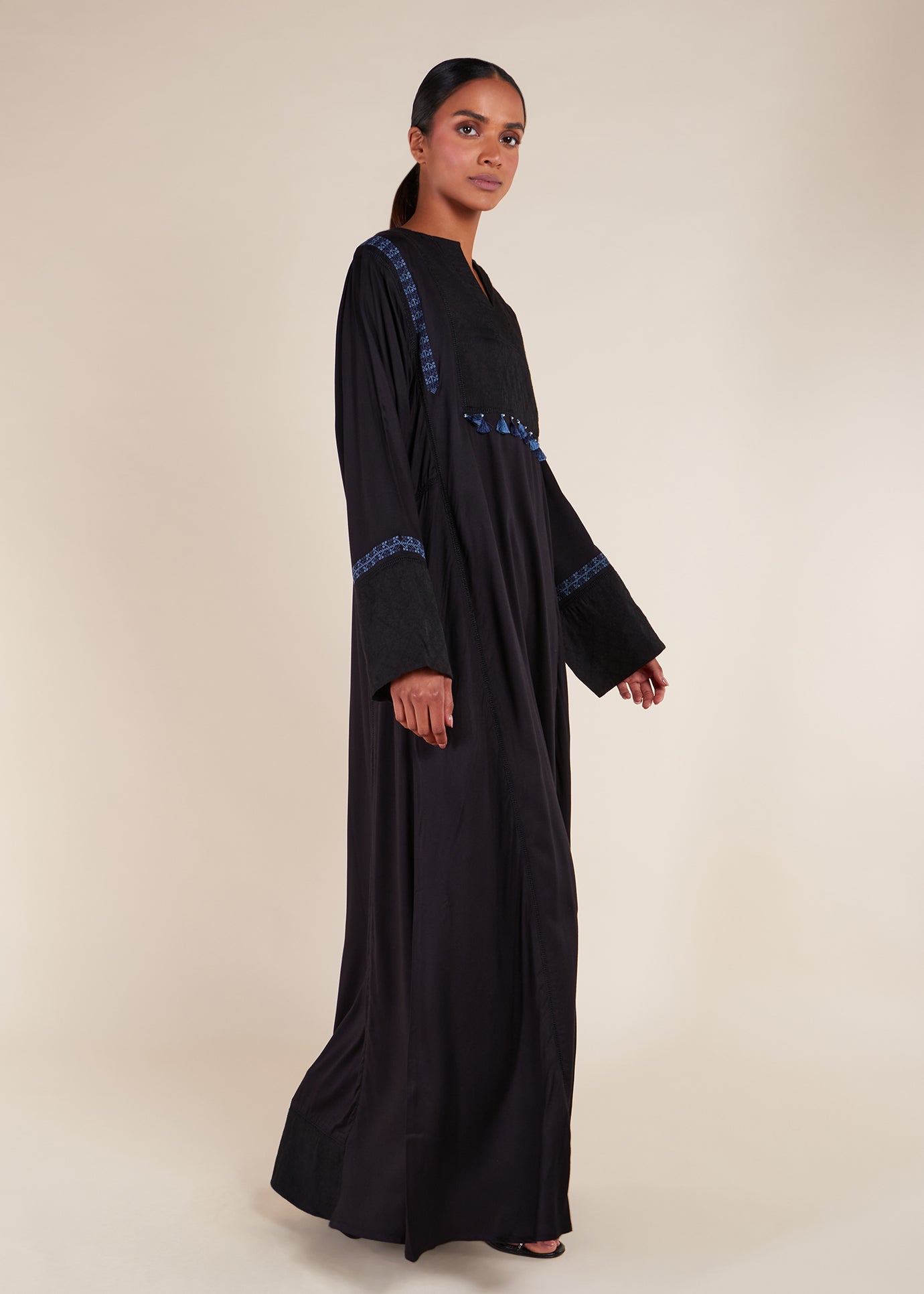 Featuring exquisite Tatreez embroidery in deep blue shades, this Abaya is adorned with delicate lace detailing on the sleeves and bodice, complemented by handcrafted tassels positioned just below the bodice. This sophisticated and graceful garment is ideal for special occasions. Designed with a loose fit silhouette, it is advisable to select your usual size for the best fit.