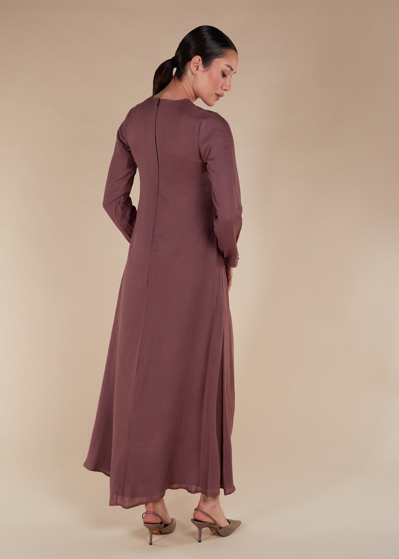 Made from a textured fabric in a warm rose tone, our Textured Longline Abaya is fully lined for added comfort. This abaya also features a seam running down the abaya and discreet zip opening at the back.