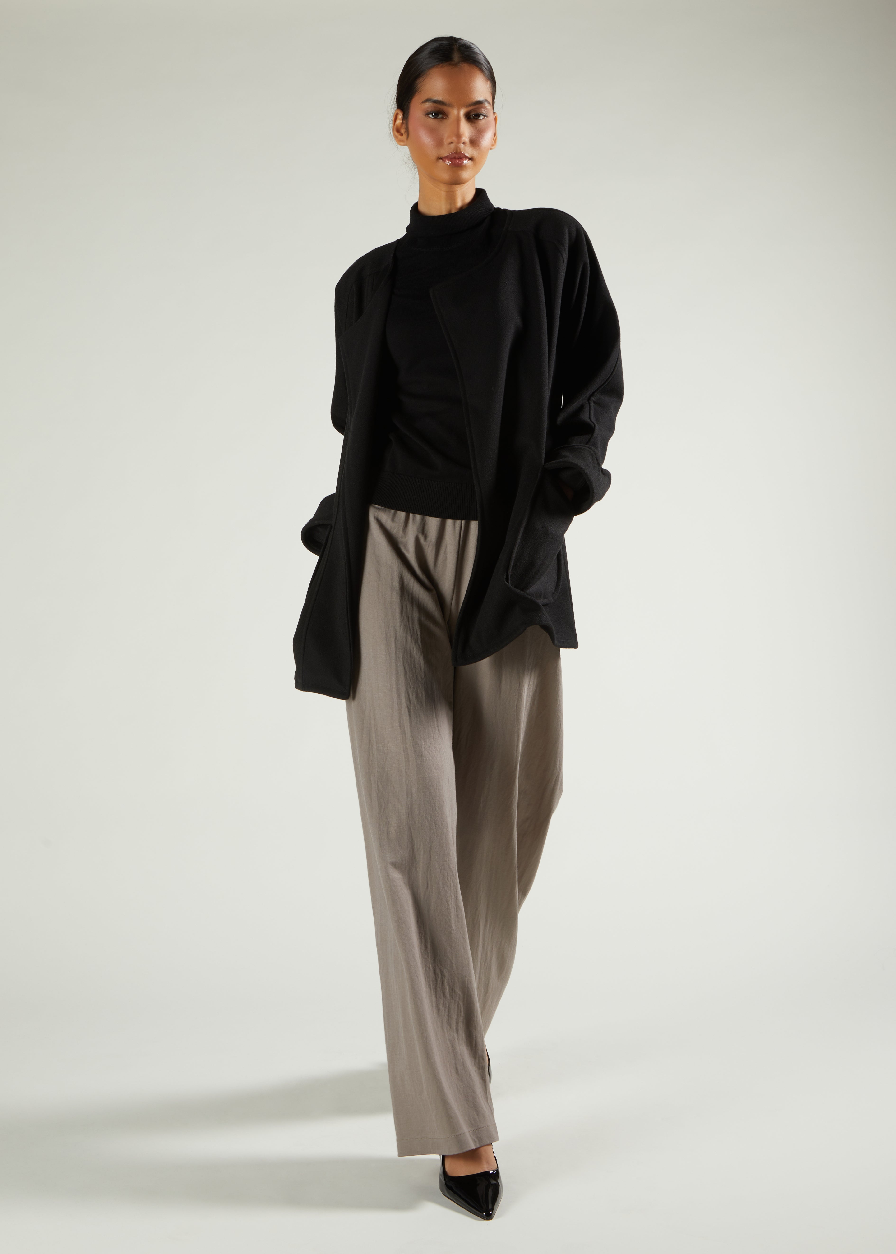 The Tote Jacket offers a simple yet stylish layer to complement your Abayas, Maxis, or modest attire. Featuring no buttons or zips, it can be worn open or cinched with a belt, enhancing your daily ensembles effortlessly. Made from a wool-look fabric, it’s perfect for layering or providing quick warmth on cooler days.