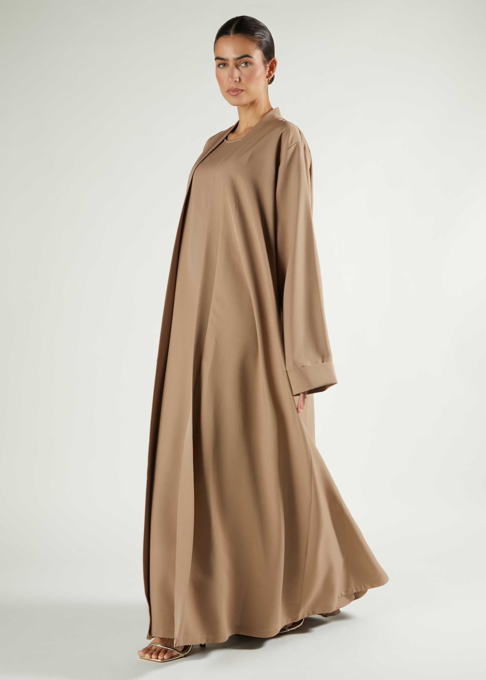 This two-piece Abaya is made from thicker, warmer fabrics ideal for colder weather. Offered in four subtle, refined shades that complement the winter season, it features a crease-resistant, durable design. You can wear it with or without the open Abaya, while the inner piece includes full sleeves for added coverage and comfort.