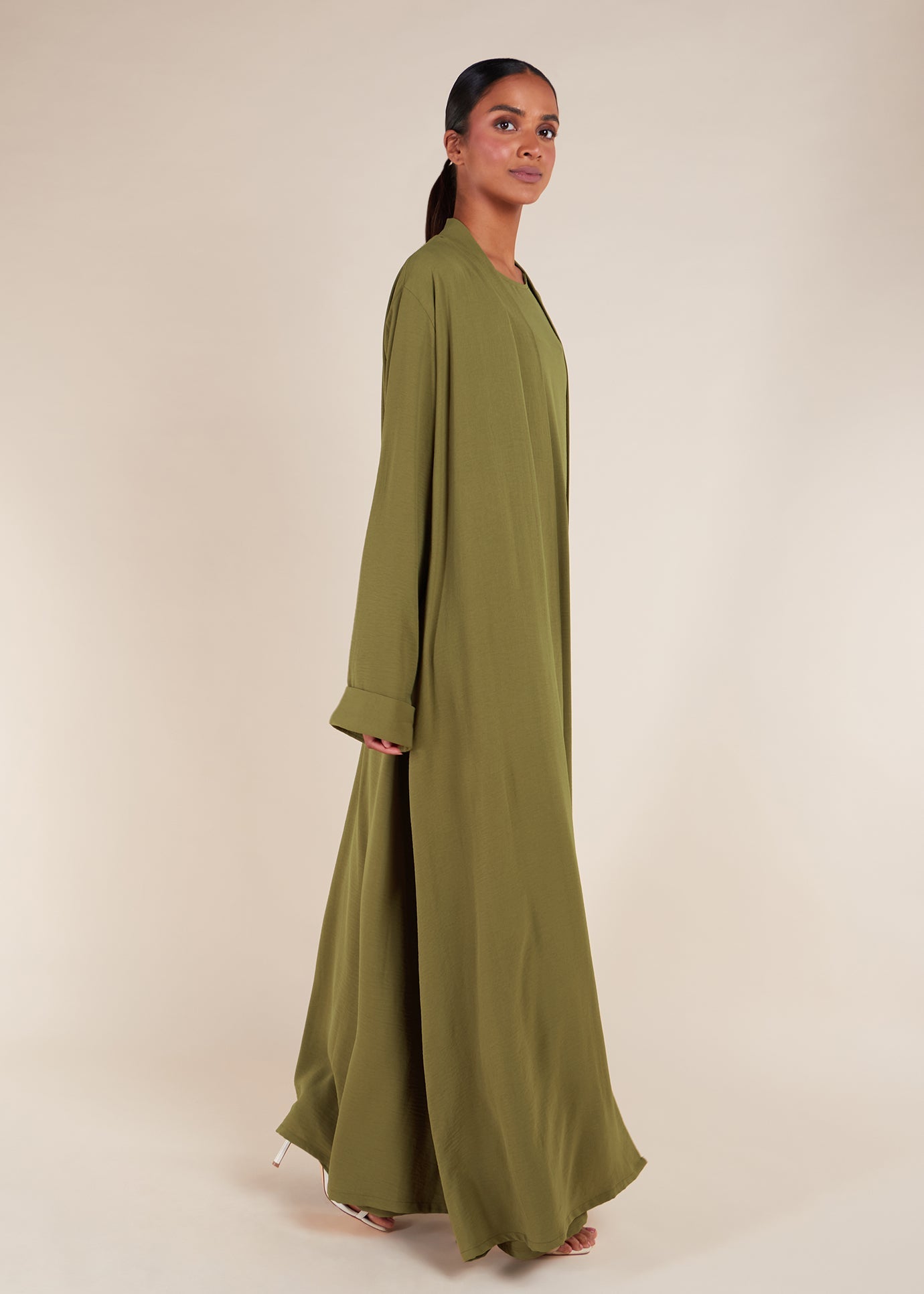 This elegant Two-Piece Open Abaya set includes a Full Sleeve matching slip. Perfect for everyday wear, it can also be dressed up with accessories for an evening look. The full sleeve slip dress can be worn as a maxi dress on its own or paired with the open abaya for a stylish ensemble.