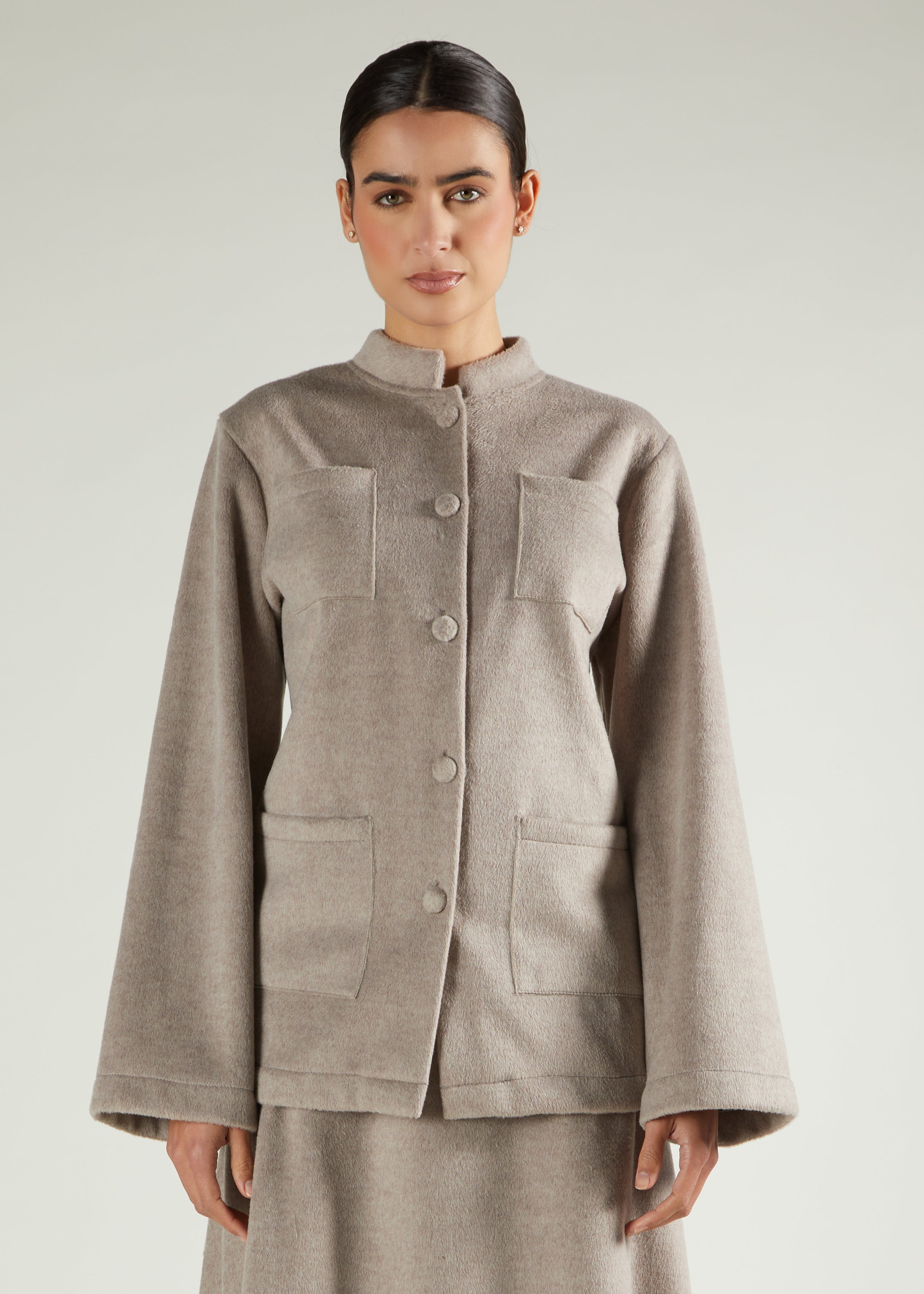 This jacket offers a sophisticated interpretation of utilitarian design. Made from a structured, warm fabric, it presents a sleek silhouette enhanced by tonal buttons and an elegant A-line shape. Its classic style is ideal for seasonal layering, combining modesty with a modern edge.