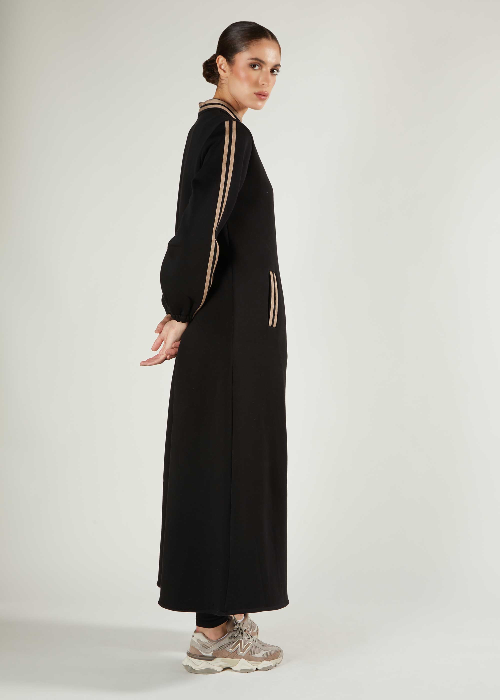 The Varsity Abaya is the perfect casual choice, featuring classic varsity details with a full front zipper. It includes contrasting stripes along the neckline, sleeves, and pockets. Offered in two timeless colours: Navy and Black.