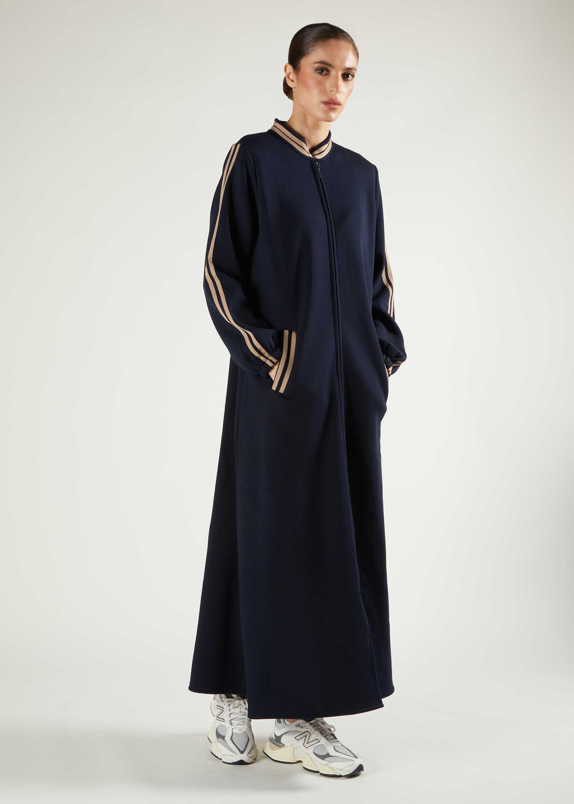 The Varsity Abaya is the perfect casual choice, featuring classic varsity details with a full front zipper. It includes contrasting stripes along the neckline, sleeves, and pockets. Offered in two timeless colours: Navy and Black.