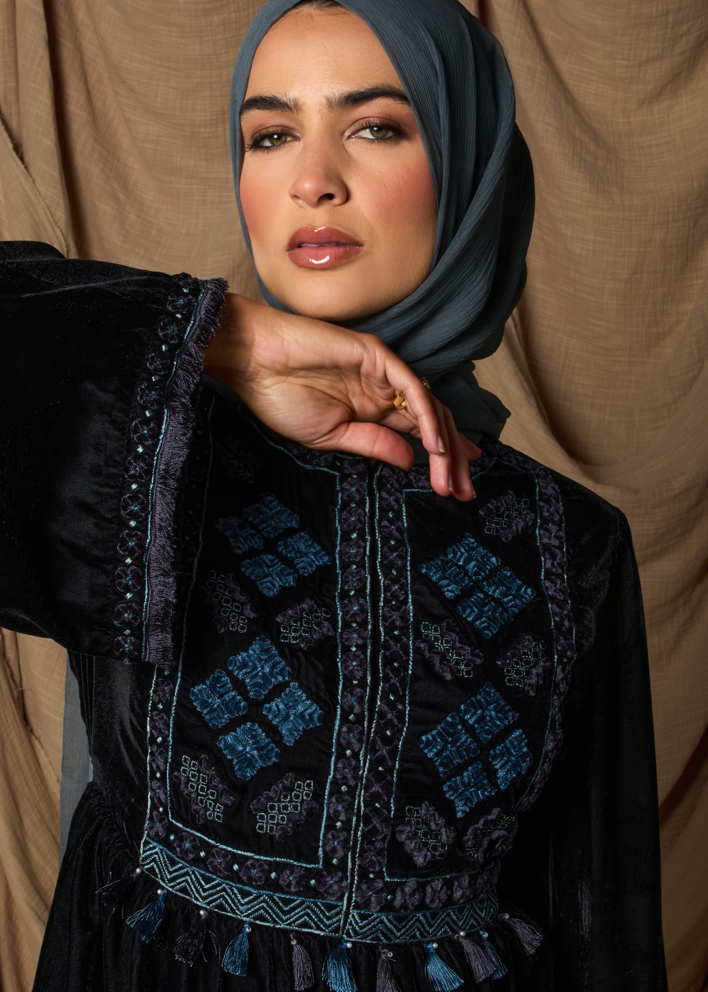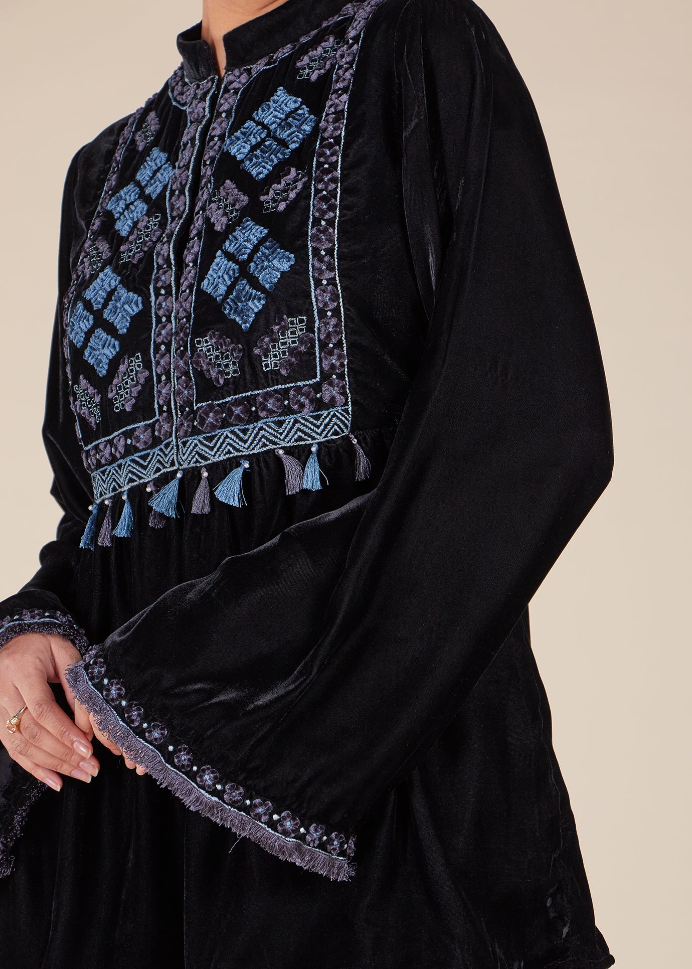 Made in rich black velvet, this co-ord set brings together artisanal detail and modest elegance. The top features intricate blue embroidery in geometric and floral motifs across the front, enhanced by subtle tassel fringe and tonal thread work. Flared sleeves are finished with embroidered borders and raw-edged fringe for added texture. Concealed titches run down the centre front for a clean, minimal closure. It’s paired with a full-length velvet skirt designed with discreet side pockets, offering a fluid silhouette with everyday ease.