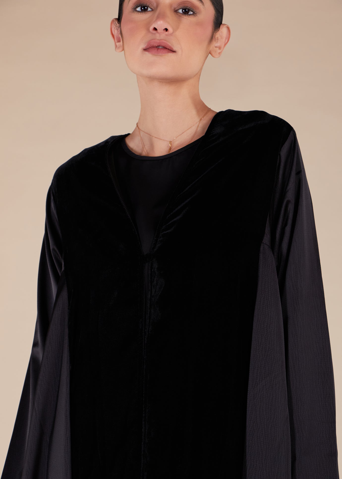 Elevate your wardrobe with the timeless elegance of the Velvet Panel Open Abaya. Made with sophistication in mind, this abaya blends luxurious velvet detailing with a fluid open-front silhouette, creating a perfect balance of modesty and refinement.