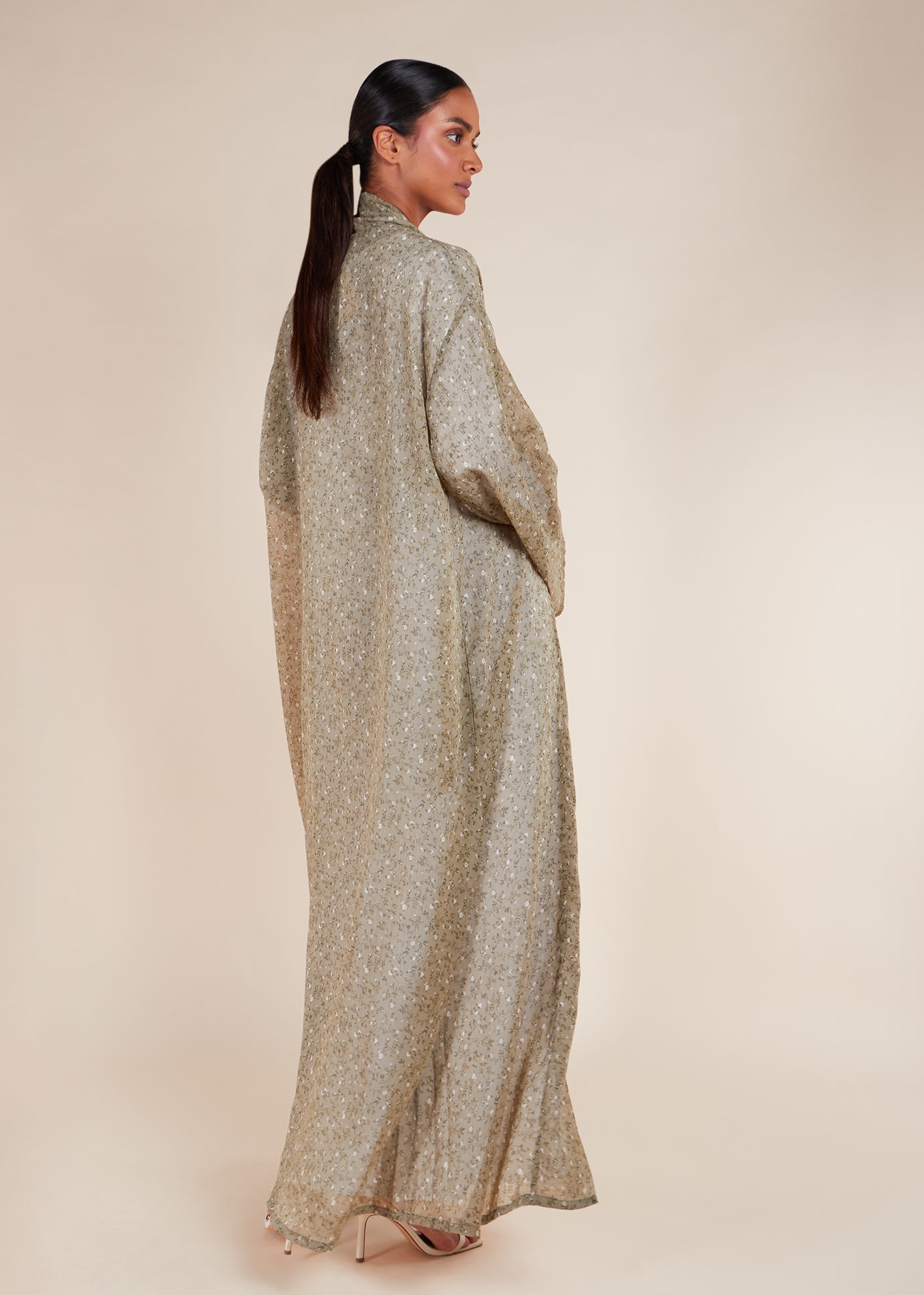 Venice Kimono features a lovely floral print in a cool olive-green shade, made from lightweight, wrinkle-resistant chiffon. Its regular fit and relaxed silhouette offer versatility, making it an ideal complement to your summer wardrobe. For a polished ensemble, style it with our Full Slips.