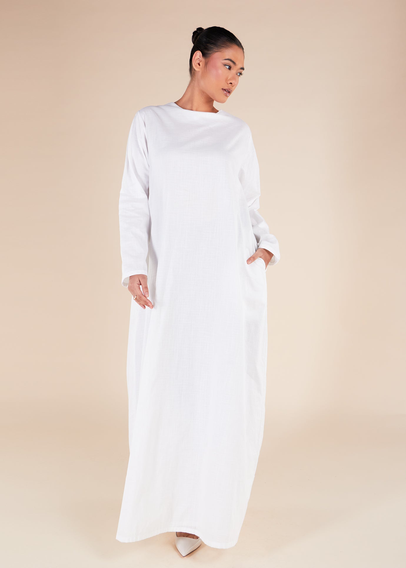 Ideal for pairing with open abayas and kimonos, this fully lined white slip dress is a must-have addition to your wardrobe, has a linen look that exudes elegance.