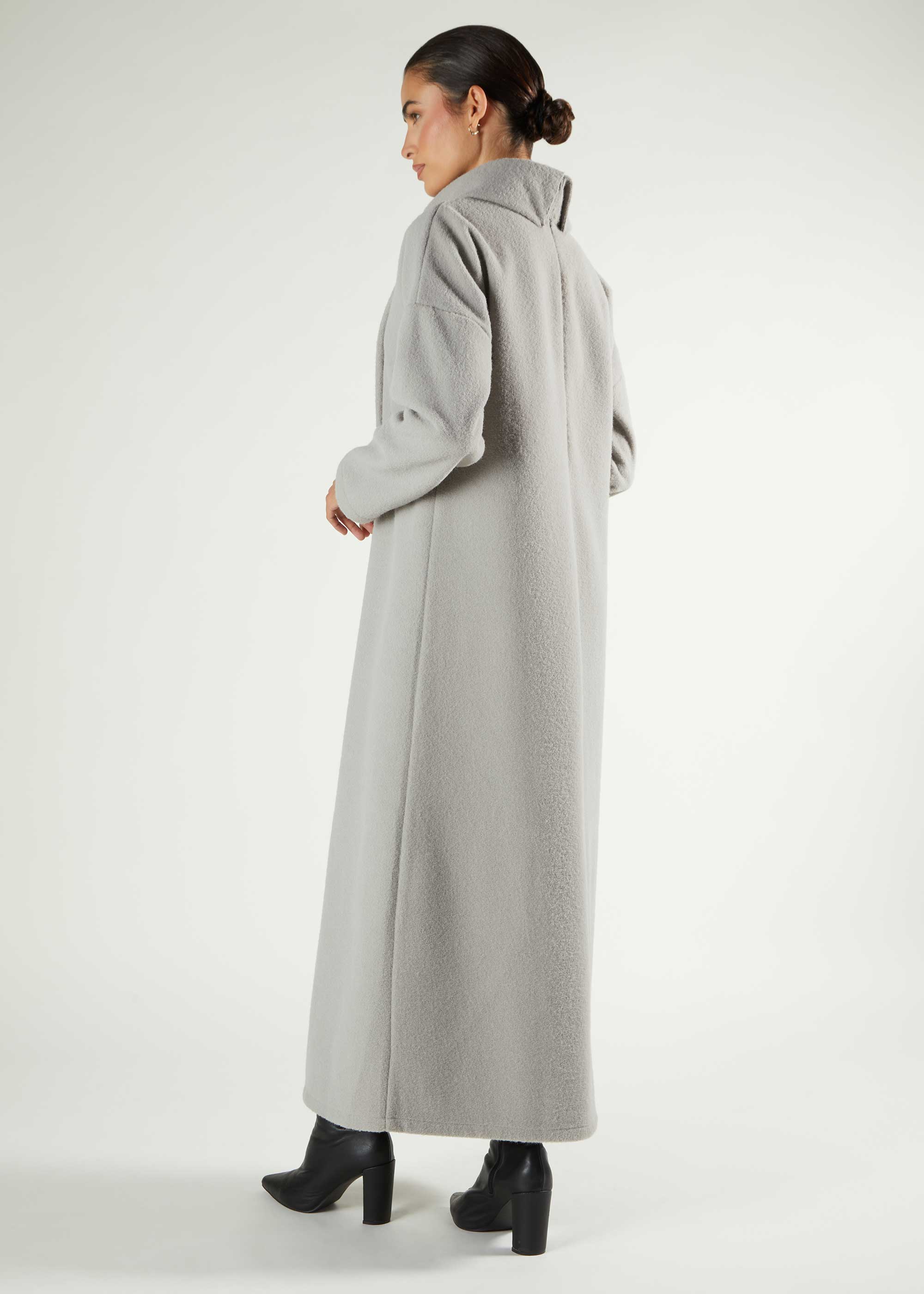 This winter-ready Abaya features a high neckline and a wool-like fabric in a cool grey shade, ideal for chilly days. It includes a back opening secured with buttons and a hidden zipper for a refined finish.