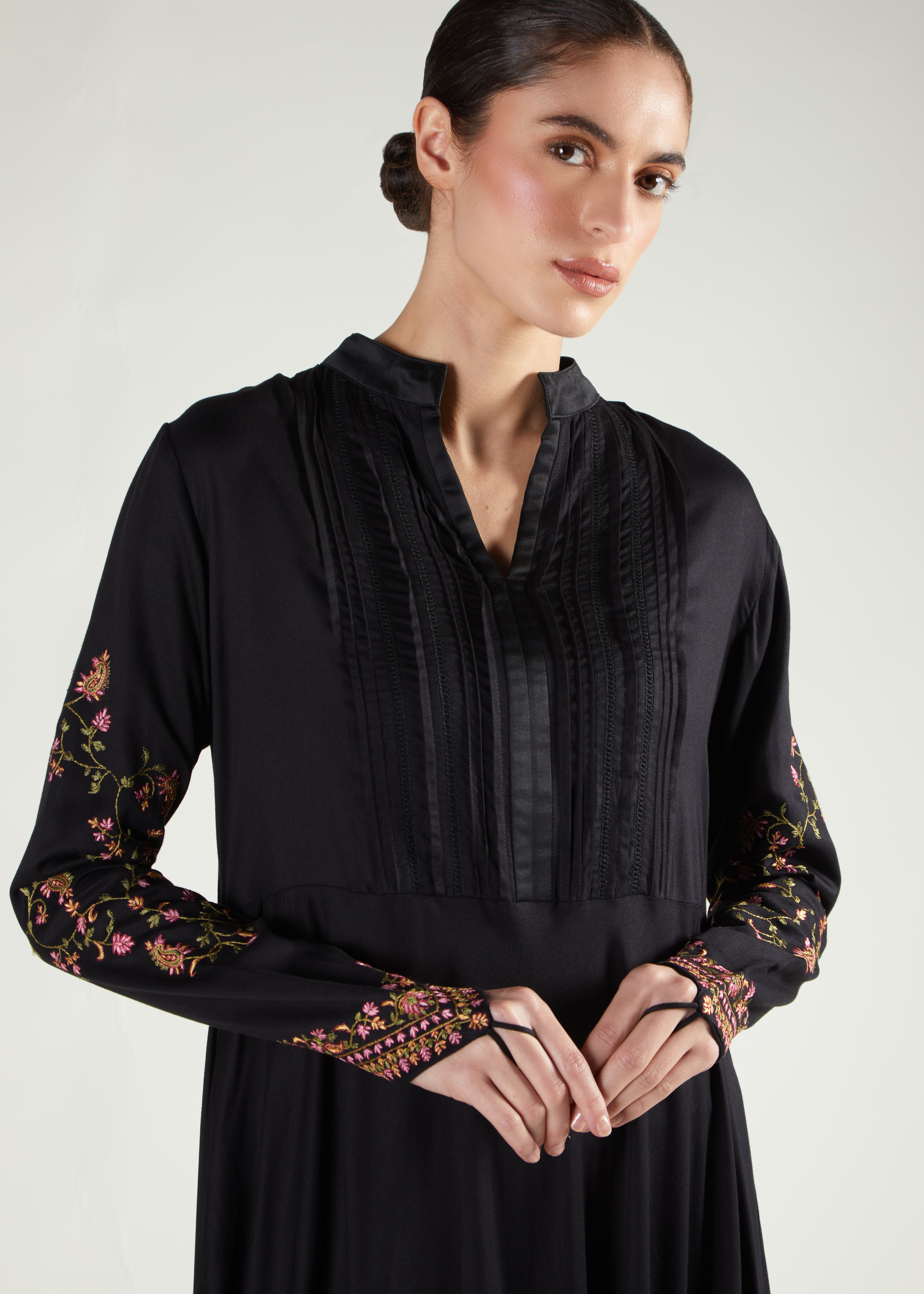 Zahra Abaya is made from a soft fluid twill fabric, features delicate floral embroidery on the sleeves as well as precision pleating on the bodice. Cut in a classic A line silhouette, this abaya features a slightly raised neckline with a V slit and functional discreet side pockets.