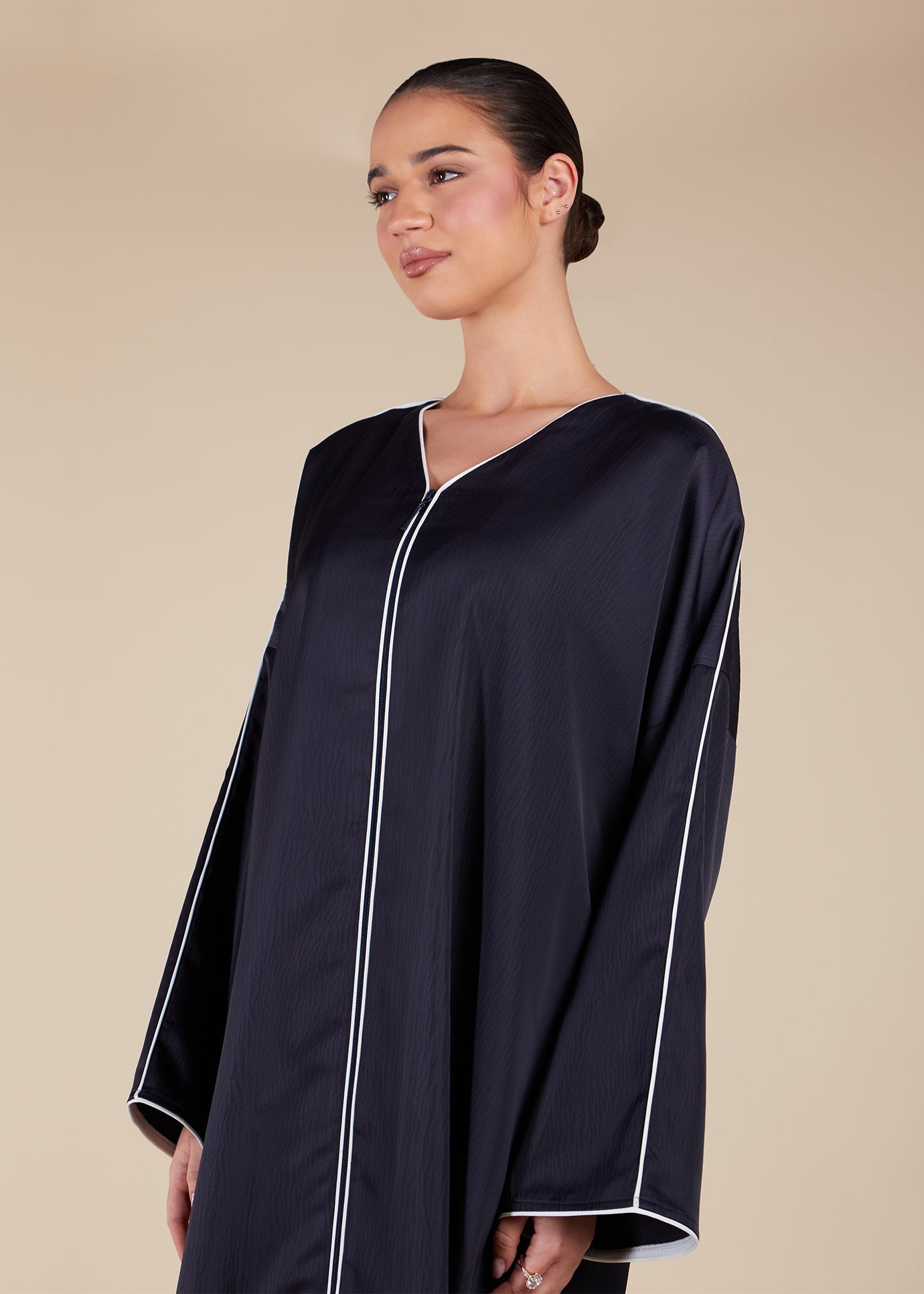 The Abaya has a longline cut design and is highlighted by white piping, enhancing its silhouette and evoking a nautical feel. With a front zip, it provides functionality and convenience, perfect for staying covered while on the move. This versatile garment is also suitable for nursing mothers and comes in both Olive and Navy shades.